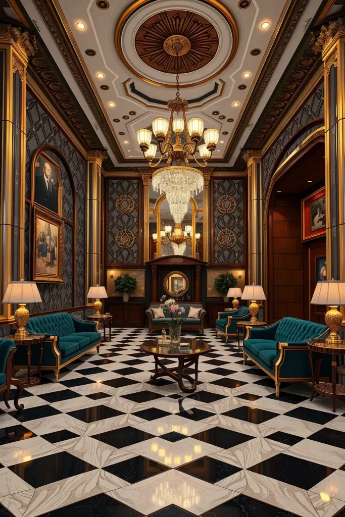 Usually, I start by covering the floor of the lobby with black-and-white Art Deco tiles and finish it with colors of velvet furniture like emerald and sapphire. These elements along with motifs use to decorate the wood like design draw attention back to the country theme. Strong geometric styles on some walls can make the area more interesting, but don’t overpower the whole area.