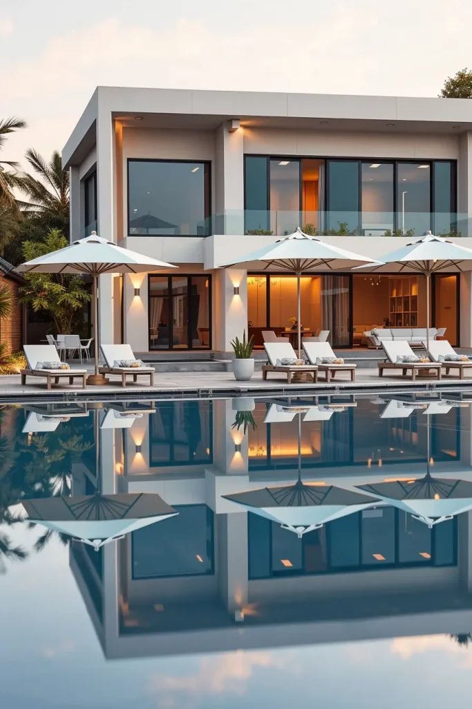 I often choose chaise-style chairs with integrated side tables, breathable sling fabrics, or sculpted plastic shells. These materials dry quickly and maintain their shape, making them ideal for poolside comfort. Their restrained color palettes help maintain a calm visual flow around the water.