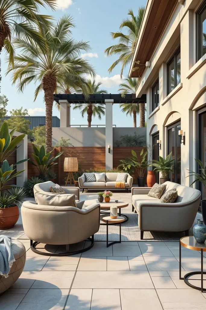 To strengthen this section, I would suggest pairing curved chairs with circular tables or rounded planters to reinforce the fluid visual language.