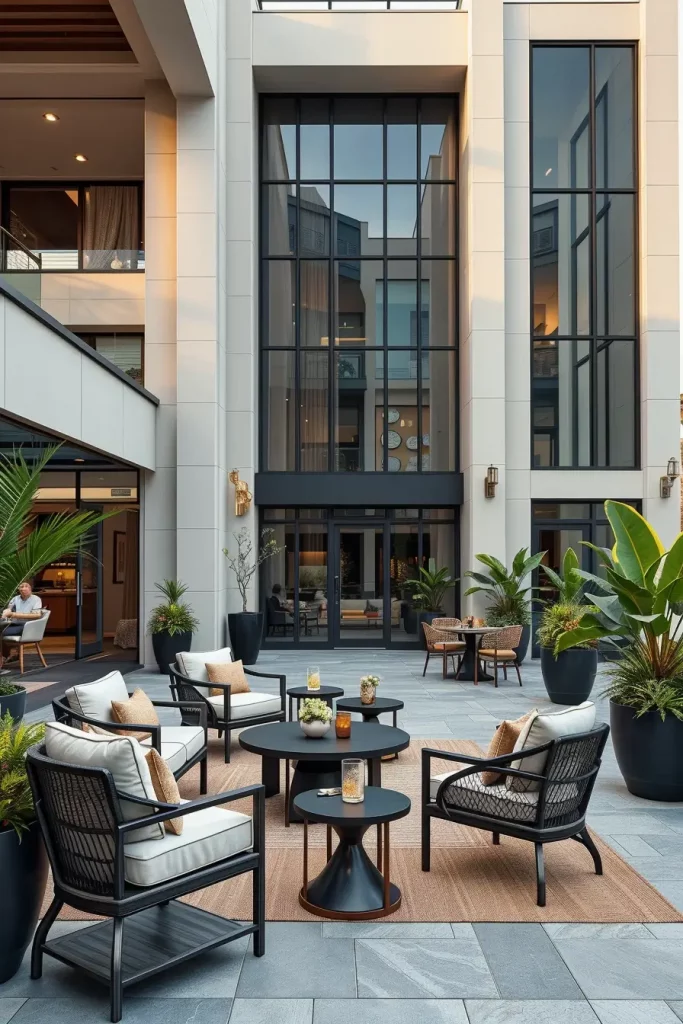 From sculptural lounge chairs to oversized armchairs with strong silhouettes, each piece is selected to anchor the space. I prioritize materials like molded resin, powder-coated aluminum, or weather-treated wood because they allow designers to experiment with form while remaining durable outdoors. These chairs often replace multiple smaller seating options, simplifying layout and circulation.
