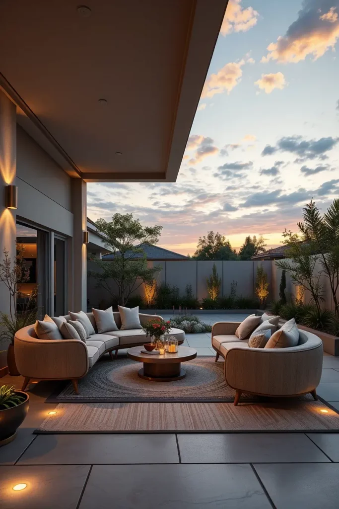 To complete this section, I would add layered outdoor lighting such as floor lanterns or integrated LED strips beneath the sofa base. In my opinion, this detail enhances the curvature at night and creates a soft ambient glow that emphasizes the overall design.