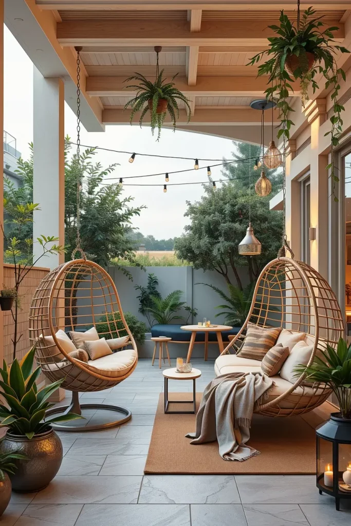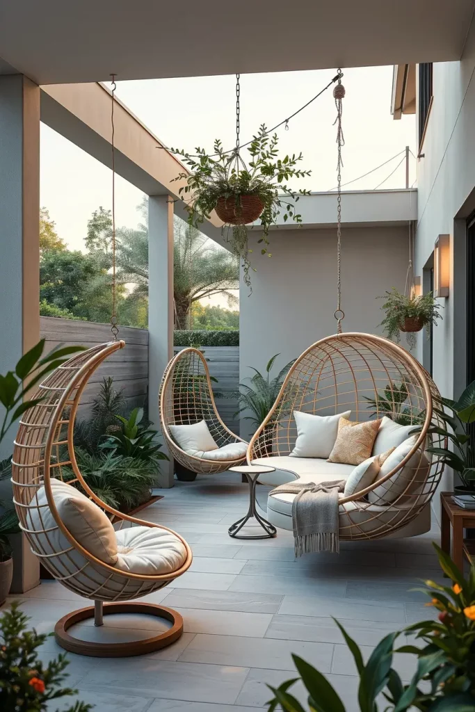 When I design such spaces, I typically include hanging egg chairs, suspended daybeds, or even ceiling-mounted sofas. Materials like weather-resistant rattan, powder-coated steel, and soft neutral cushions help maintain durability without sacrificing aesthetics. I also make sure the surrounding elements—such as minimal side tables, outdoor rugs, and soft lighting—complement the floating effect rather than compete with it.