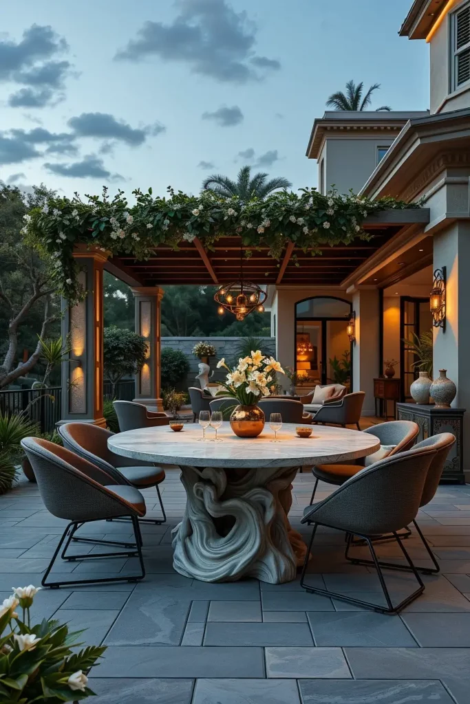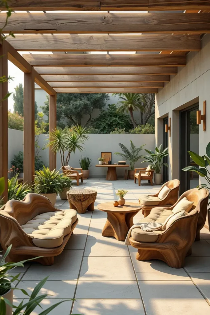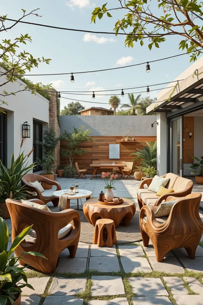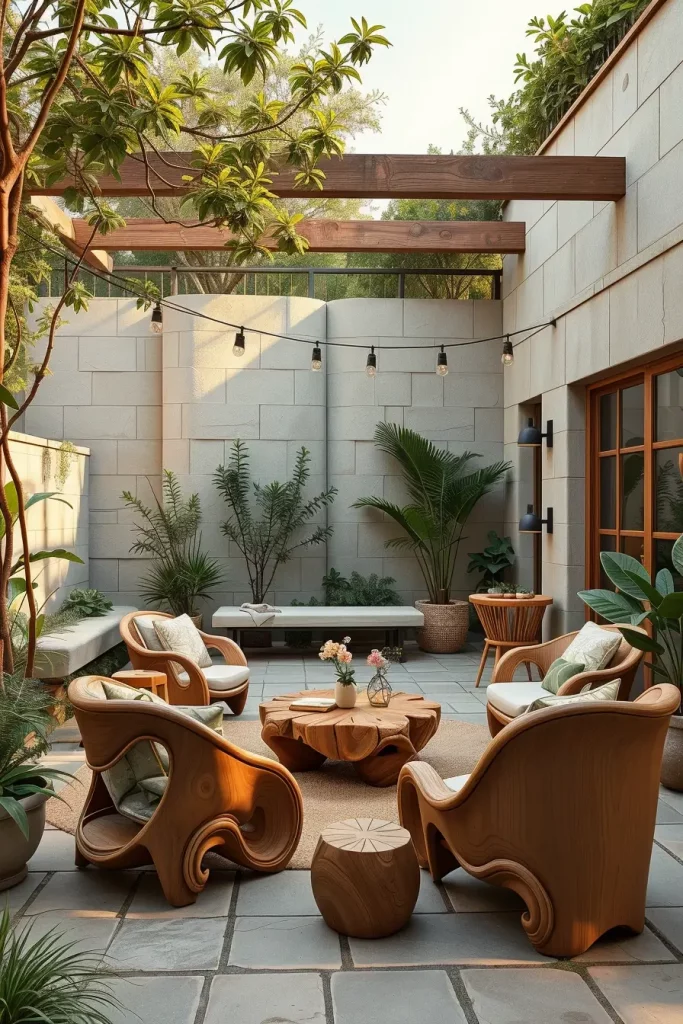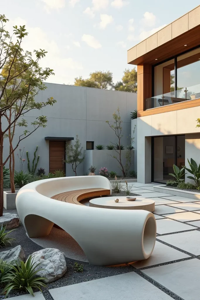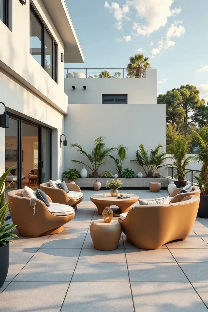 I often incorporate benches that double as storage units, modular seating that can be rearranged, and tables with hidden compartments. These designs are especially useful for smaller patios, where maximizing space is essential. The curved and fluid forms of such furniture add a sense of movement and elegance.