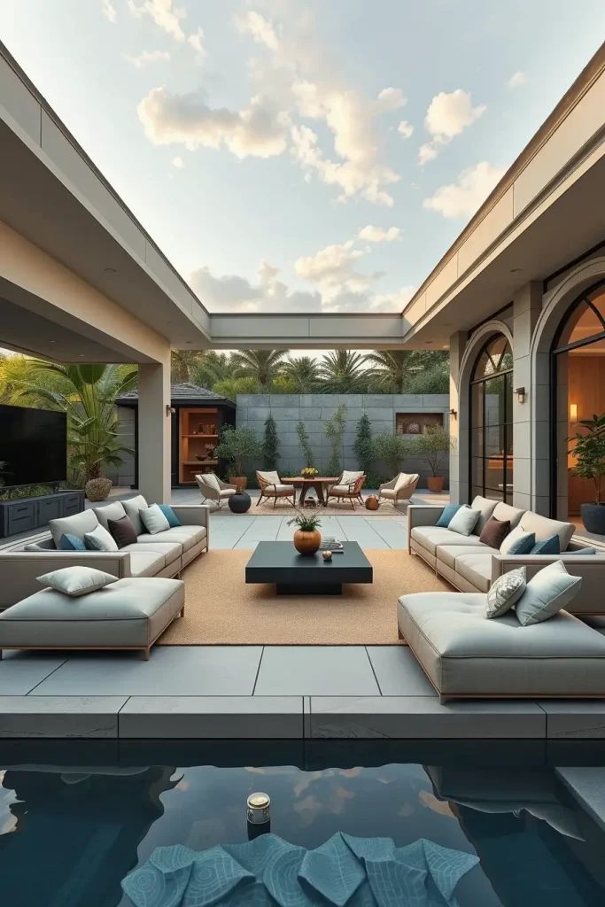 In my work, I carefully select performance fabrics that are UV-resistant and water-repellent while still offering a luxurious feel. Upholstered sectionals, oversized cushions, and accent chairs with intricate patterns bring personality and depth. These elements help create a unique and inviting environment that feels both relaxed and sophisticated.