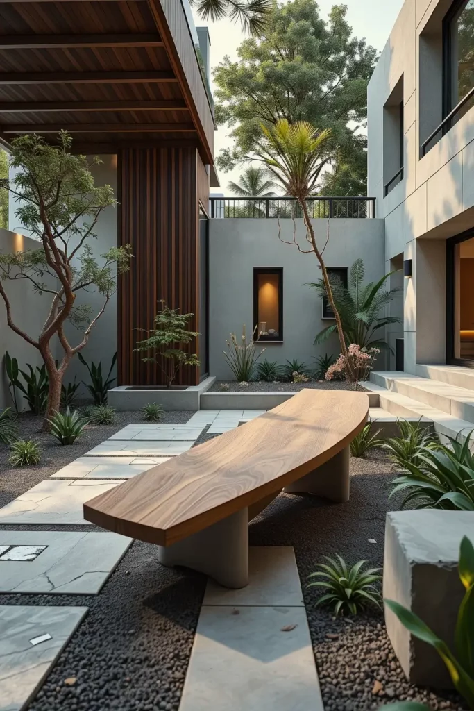 In my projects, I often include furniture made from reclaimed wood, recycled plastics, or responsibly sourced teak. These materials are shaped into bold, organic forms—curved lounge chairs, artistic tables, and asymmetrical benches. The tactile quality of these materials adds depth, while their natural tones create harmony with the outdoor environment.