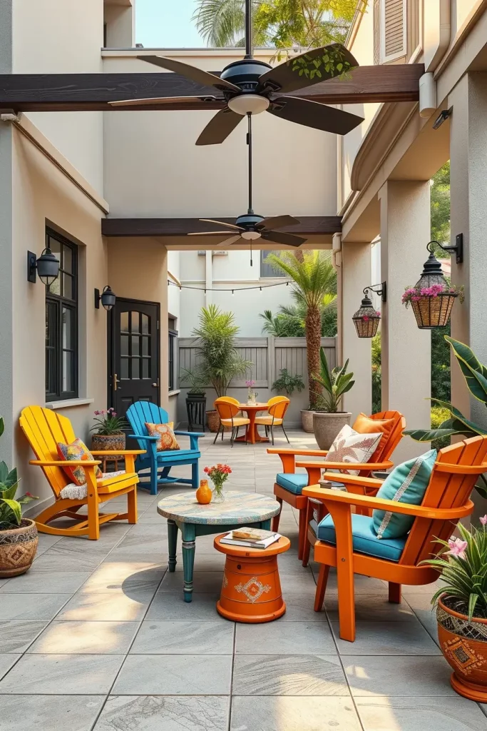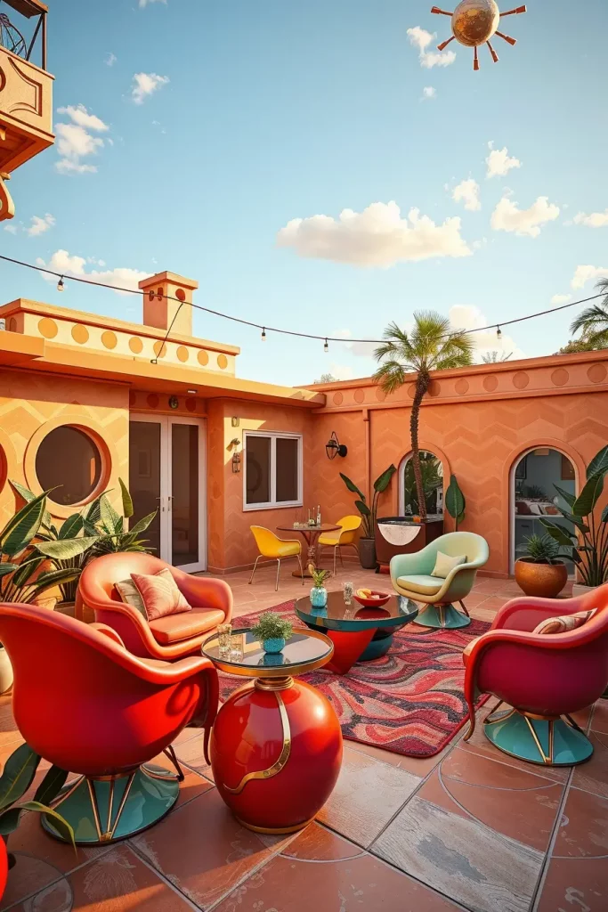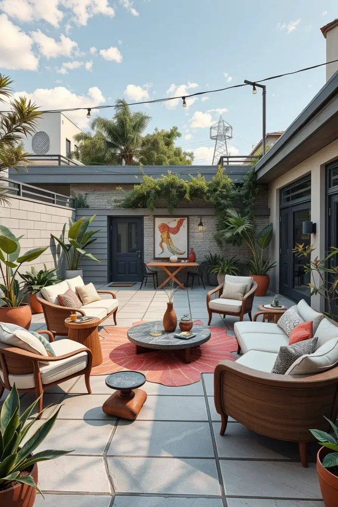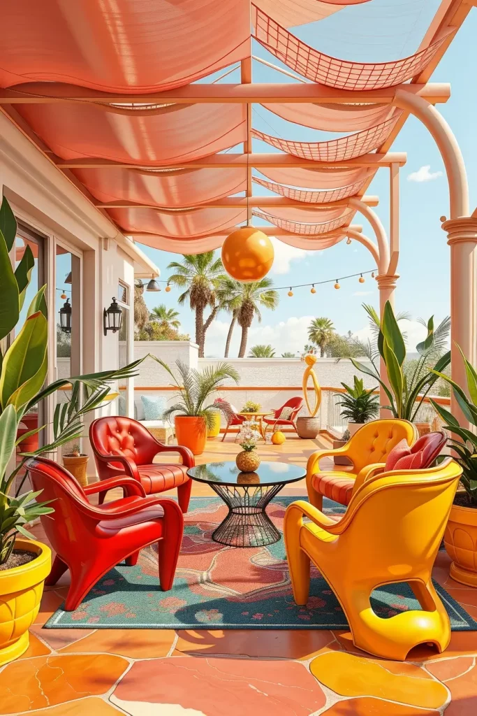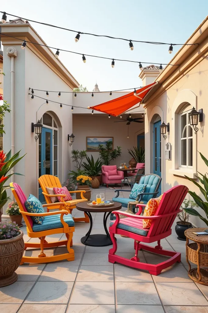 I typically incorporate vibrant lounge chairs, painted metal tables, or cushions in saturated hues like terracotta, cobalt blue, or mustard yellow. These elements are often paired with neutral backdrops—such as stone or wood—to maintain balance. The key is to use color intentionally rather than excessively.