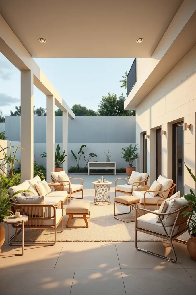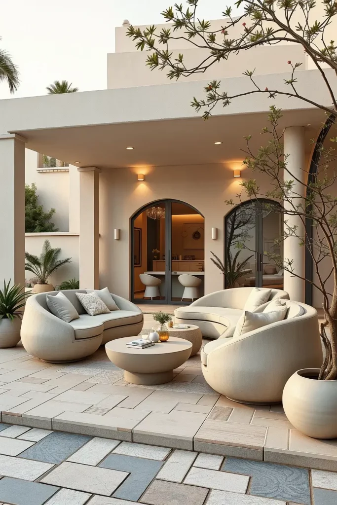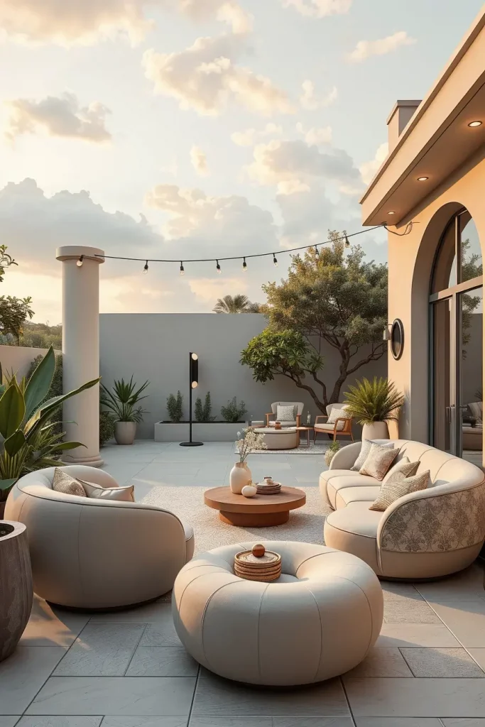 In my projects, I typically include curved lounge chairs, low-profile sofas, and rounded coffee tables in muted tones. Materials such as textured fabric, matte stone, and light wood enhance the understated elegance. I also layer subtle elements like neutral outdoor rugs and soft cushions to maintain cohesion while adding comfort.