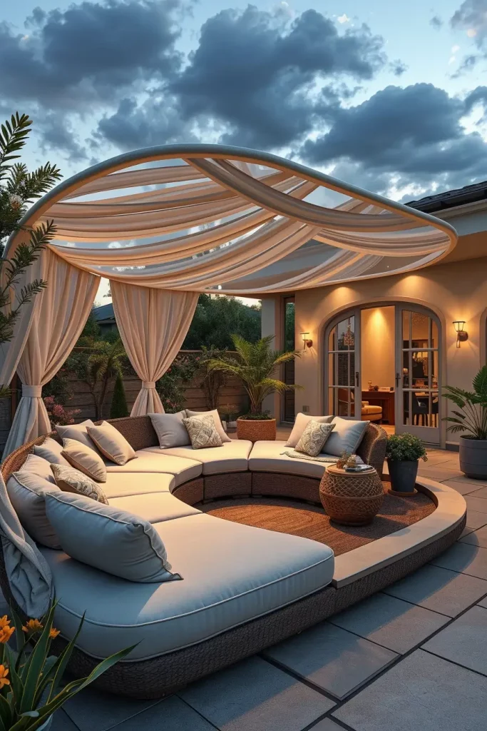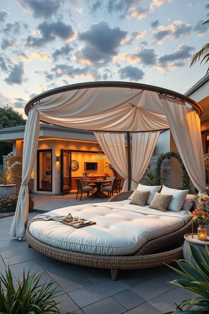 In my designs, I often choose circular or semi-enclosed daybeds with weather-resistant upholstery and integrated canopies. These structures provide both comfort and privacy, making them ideal for lounging or reading outdoors. I also ensure that they are complemented by side tables and soft lighting to enhance usability.