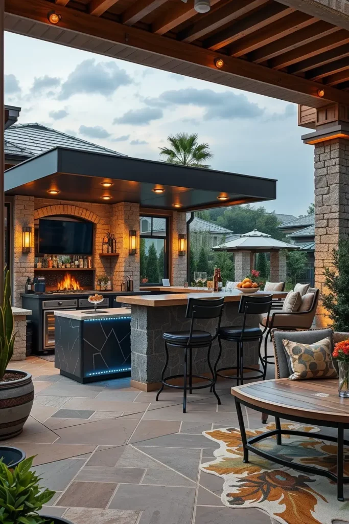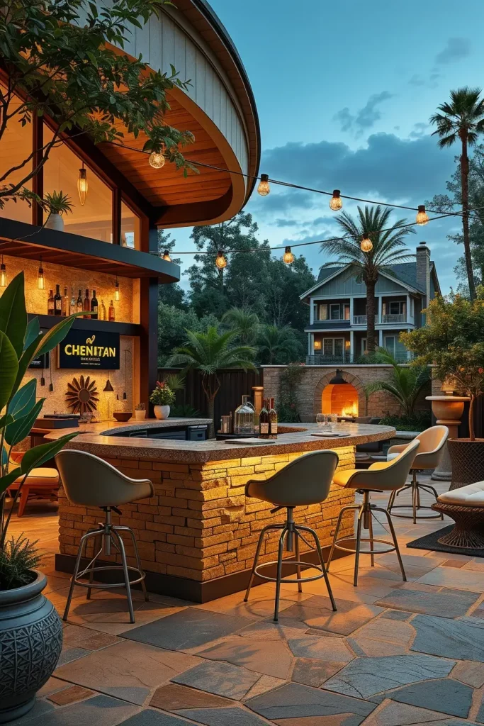 In my designs, I incorporate bar counters with stone or terrazzo surfaces, high stools with curved backs, and integrated shelving for glassware and decor. I often add subtle lighting under the counter to highlight textures and create ambiance. These details transform a simple bar into a stylish and artistic focal point that enhances the entire patio.