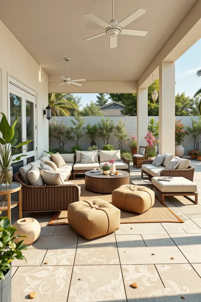 To further develop this section, I would include outdoor rugs and layered fabric elements, as they help define zones and enhance comfort underfoot.