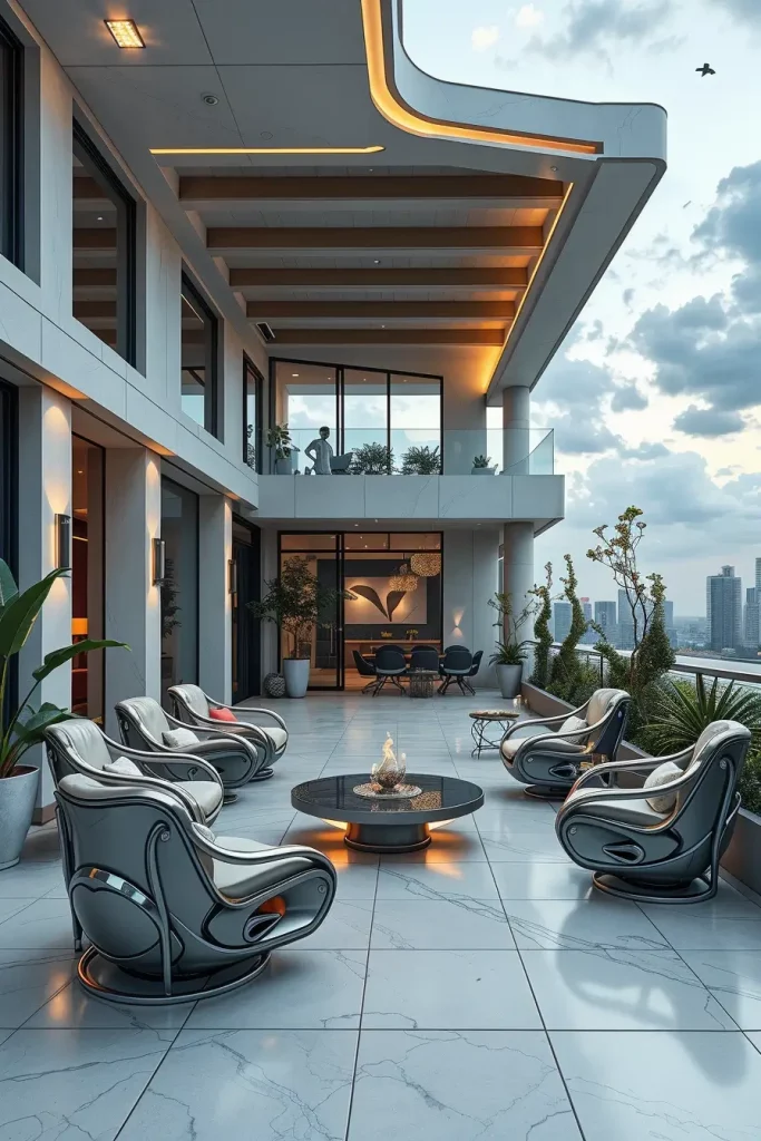 To enhance this concept, I would add statement lighting and sculptural planters, which complement the futuristic aesthetic and complete the overall look.