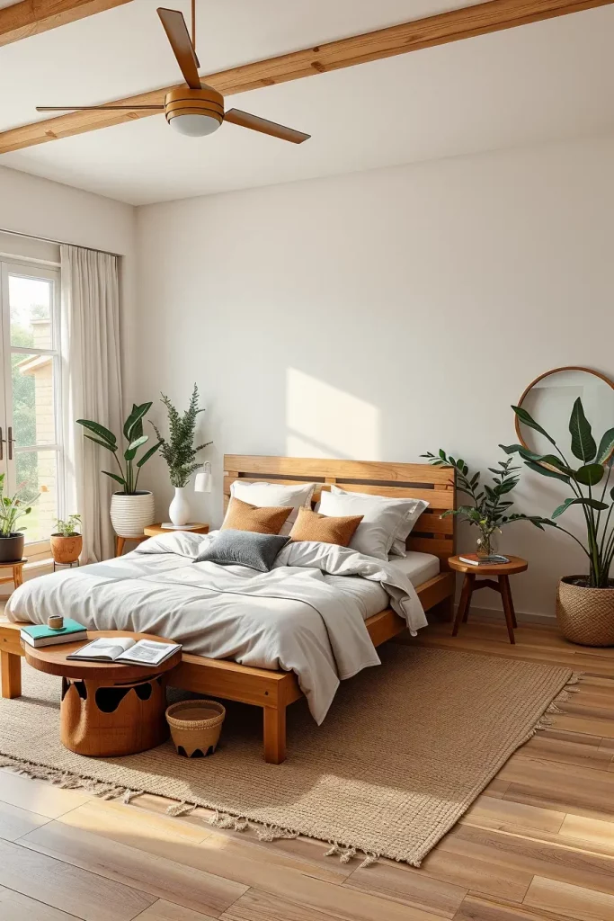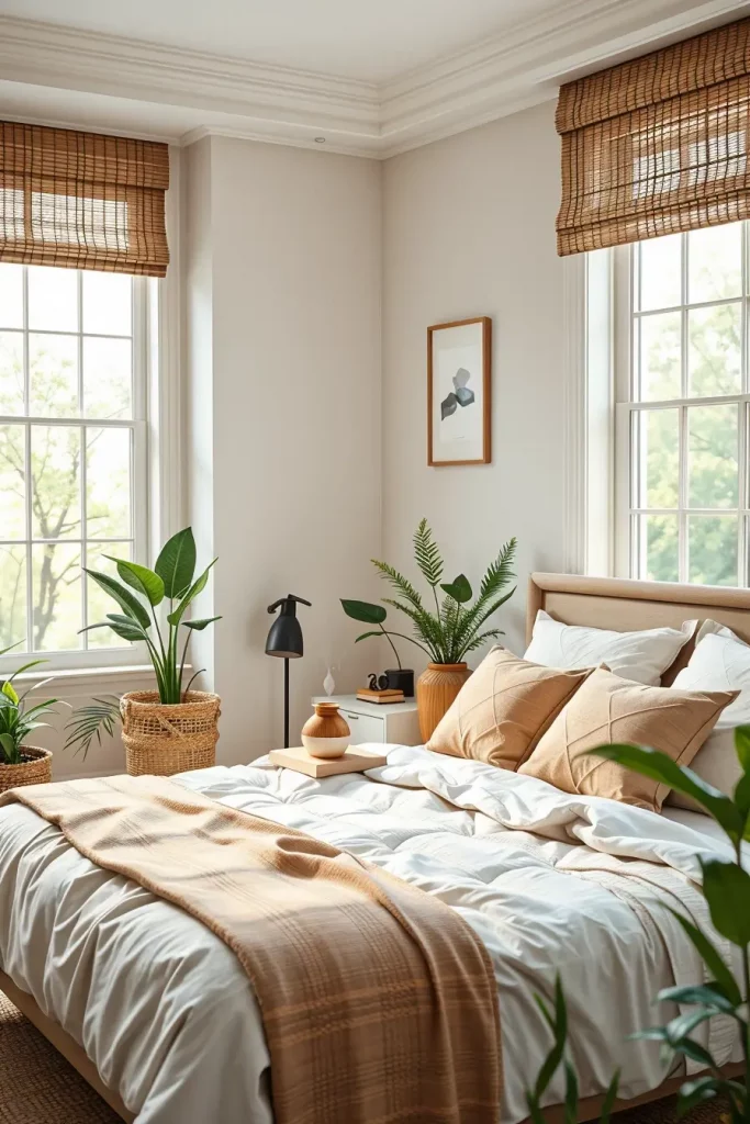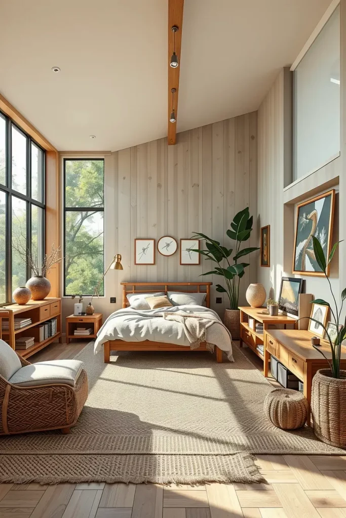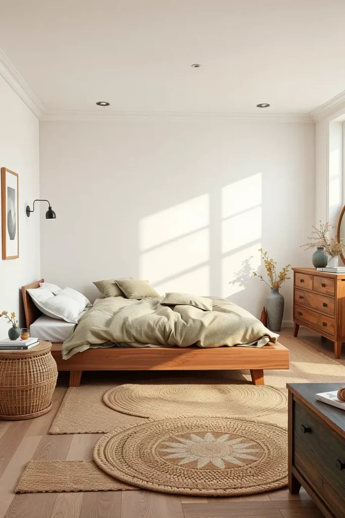 How you use and combine materials is as important in biophilic bedroom design as the room’s organization. I use solid wood, jute, bamboo, rattan, wool and stone where possible. They provide the room with visual comfort and richness that artificial textiles don’t have.