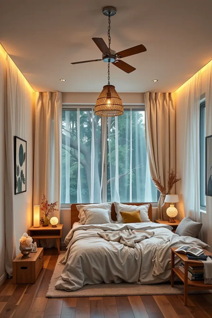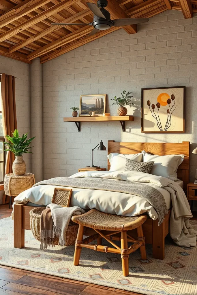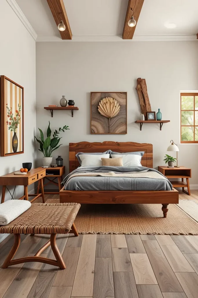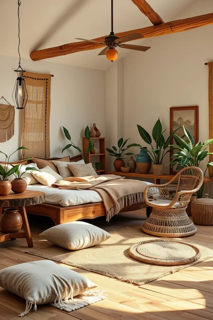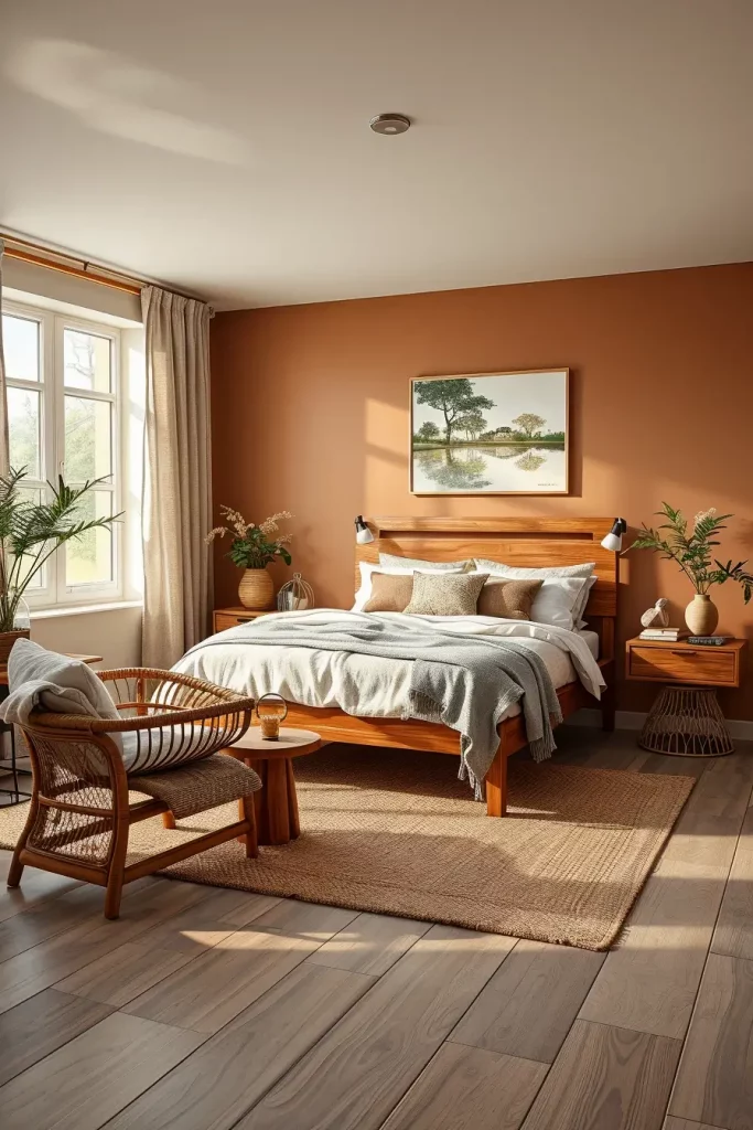 How you use and combine materials is as important in biophilic bedroom design as the room’s organization. I use solid wood, jute, bamboo, rattan, wool and stone where possible. They provide the room with visual comfort and richness that artificial textiles don’t have.