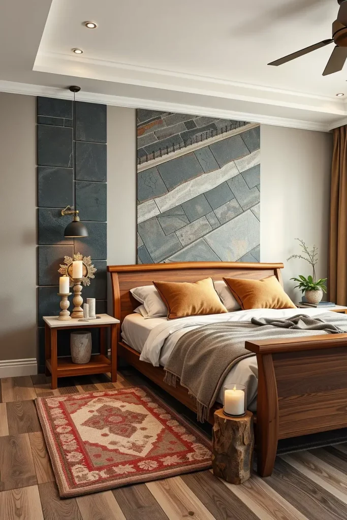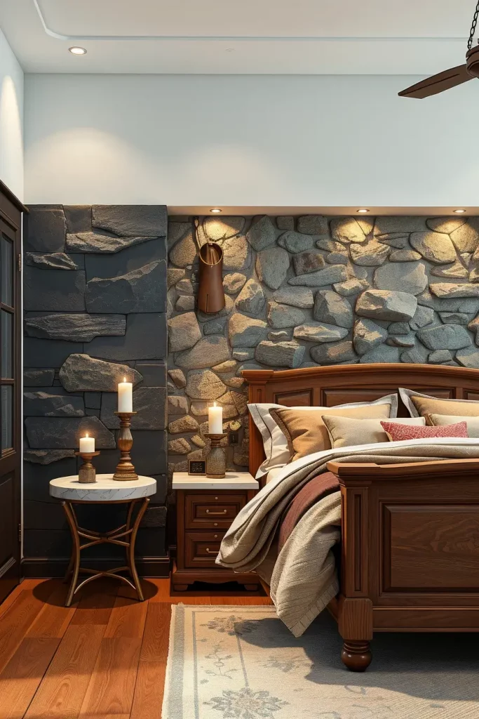 I like the look of a slate or marble accent wall as the backdrop to a headboard, because it brings interest and balance to the room. Bring interest to your bedroom by including smooth nightstands or bedside lamps with stone supports. Giving your landscape contrast is easy with stone trays, candle holders or flooring with pebbles.