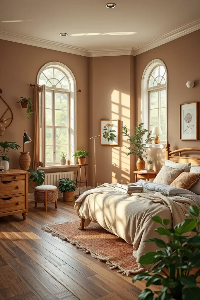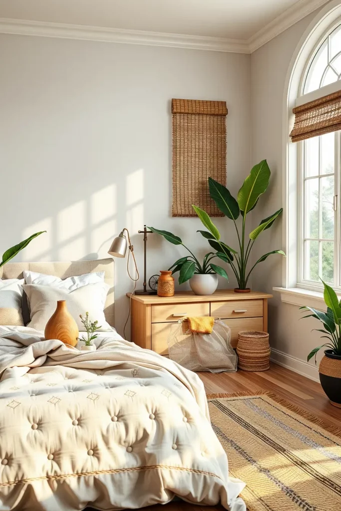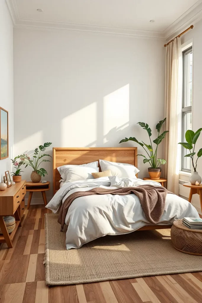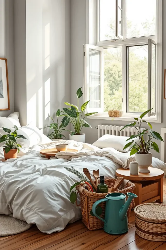 Choose self-watering planters if you want to grow monstera or philodendron. Choose bedding made from washable organic cotton or linen. Use oils that are not dangerous for you to treat your wood surfaces and keep them shiny. Having the room open for air, trimming houseplants, wiping dust off the items and shaking out natural rugs weekly keeps it both attractive and pleasant. This regular rhythm mimics nature’s own cycles and makes the bedroom feel alive.