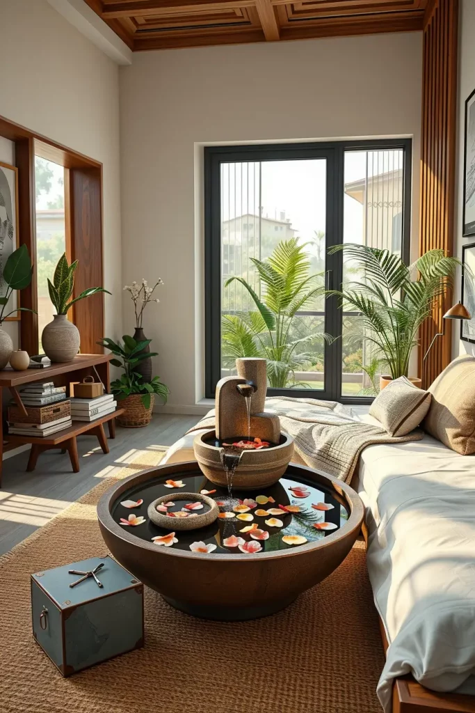 I choose to place ceramic or slate mini fountains near my wooden furniture and neutral bedding. Make a floor-level bowl your central decoration by filling it with river stones and some floating petals. The textures from linen, jute and plants go very well with these pieces.
