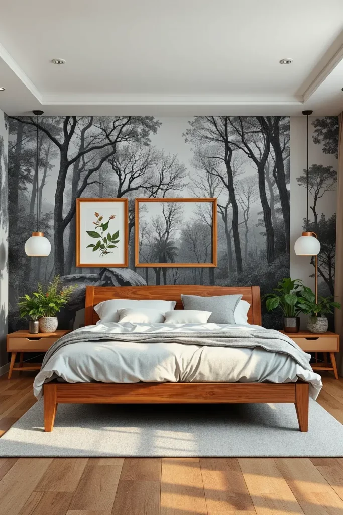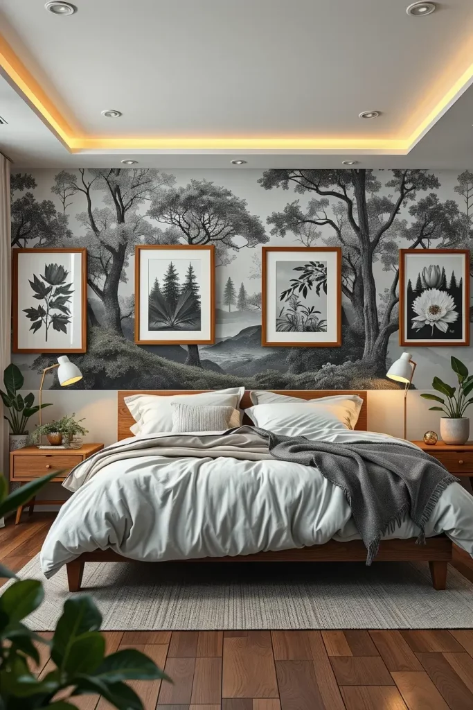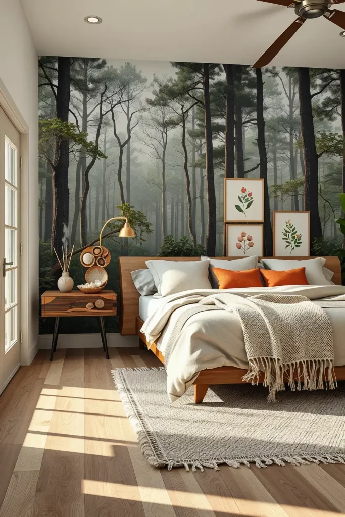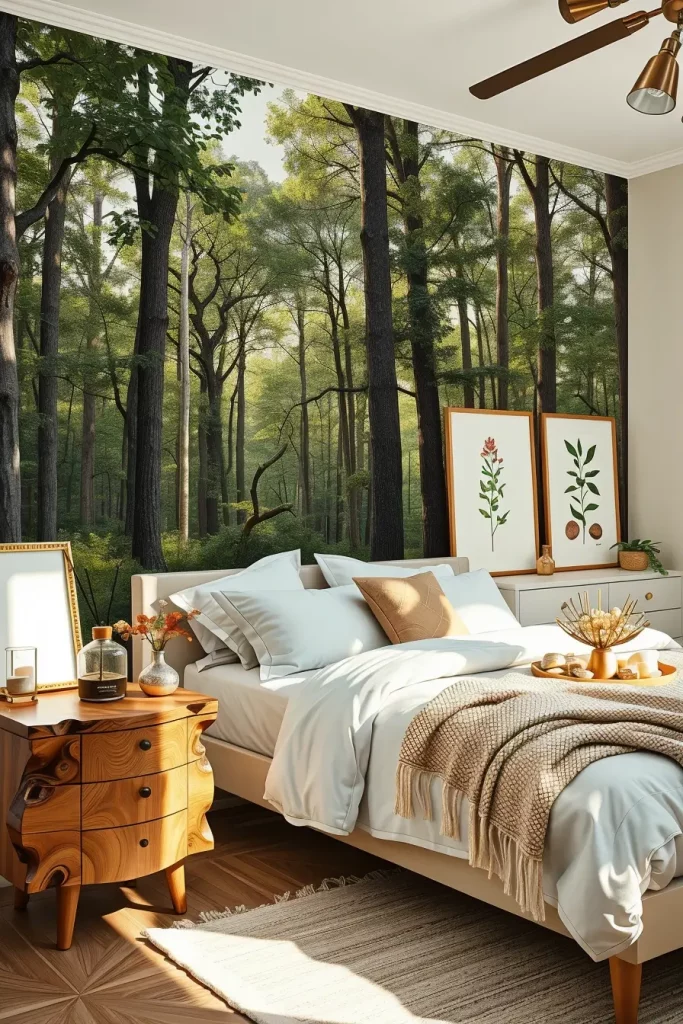 Putting up art can change a bedroom right away and in biophilic settings, prints of nature connect the room to the outdoors. Using a large decorative botanical wallpaper on one wall makes me feel as if I’m in a green space. Minimal homes often use just one interesting landscape canvas to set the scene.