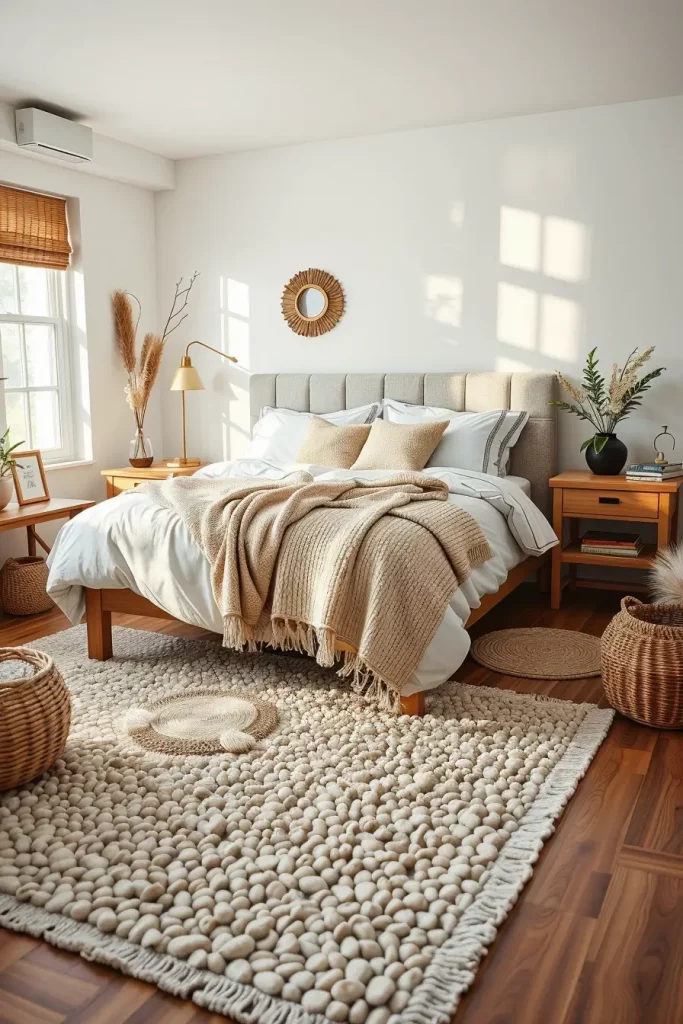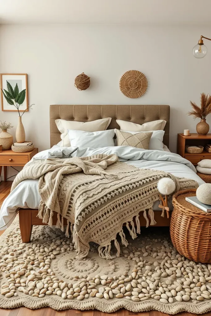 I believe high-quality cotton or hemp sheets with a relaxed, slightly uneven texture are the best for bedding. A large wool knit covering a flat linen duvet provides both a cozy look and feel. You get a natural, earthy feeling from woven baskets, wooden nightstands and rugs with a smooth pebble pattern.