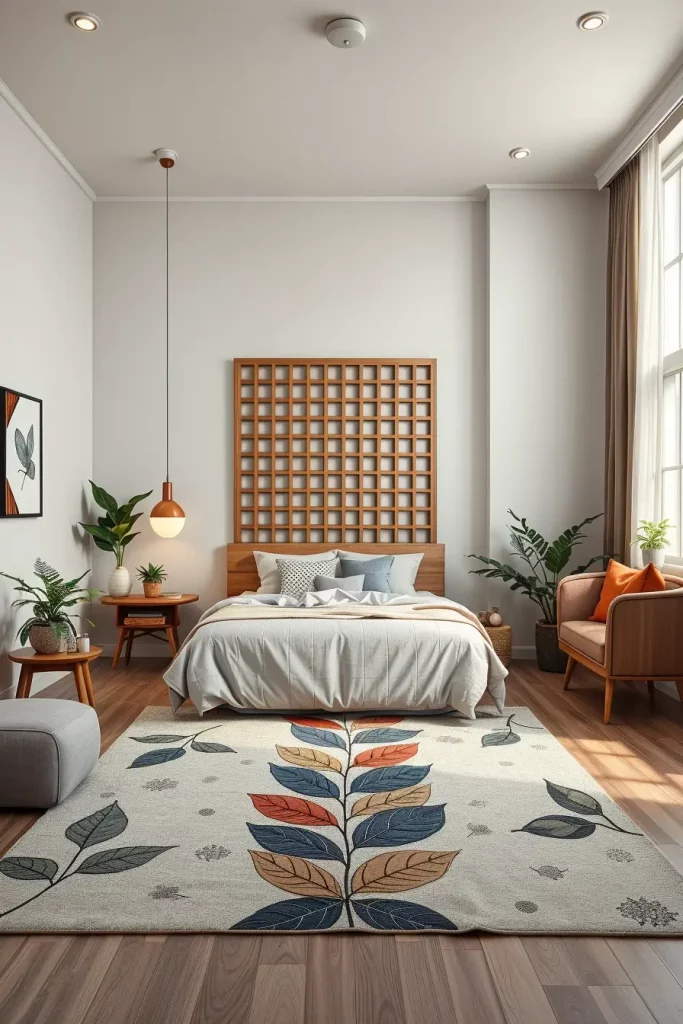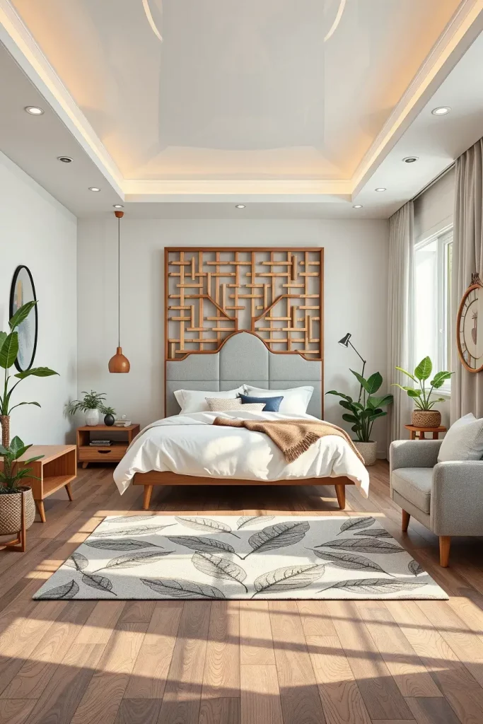 I’d like to include more examples such as decorative screens or bedding with geometric leaves in the room, unifying the space better.