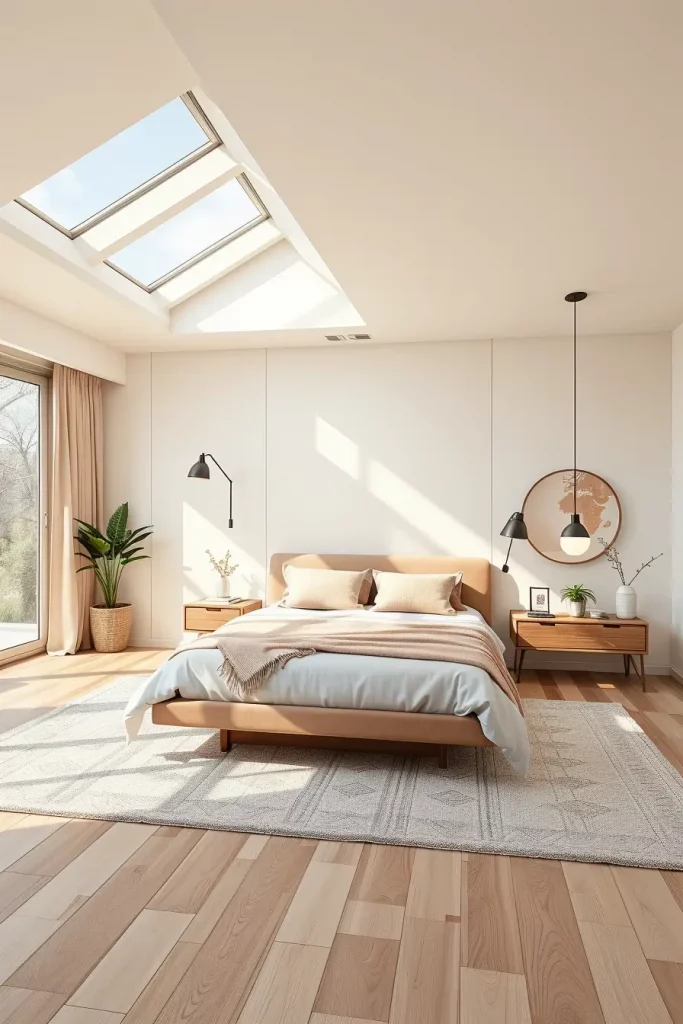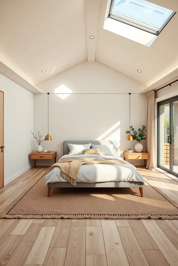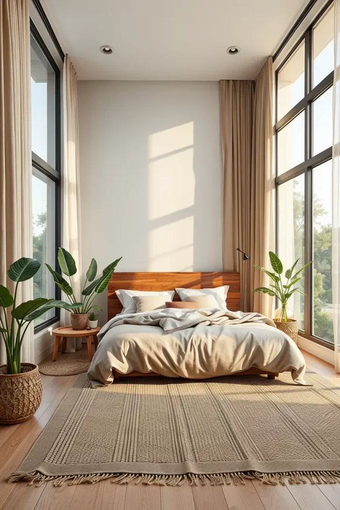 I design my biophilic bedrooms using big windows, natural bedding and bamboo or eucalyptus wood. Dull colors inspired by stone and sand help your body keep a healthy rhythm. Layered lights copy the soft luminance of the sun. A jute rug is a simple extra that gives a touch of natural comfort.