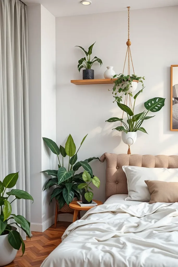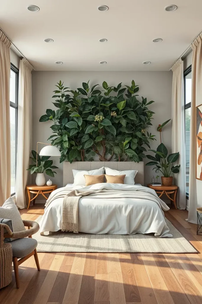 I can go with a large planter with a fiddle-leaf fig or I can add a vertical garden behind the headboard. Cutting-edge bed designs can also be shown off well by using natural wood or a textured wall behind the bed. Filling the walls with curtains from floor to ceiling in cotton or linen will enhance symmetry and direct the eye toward natural details.