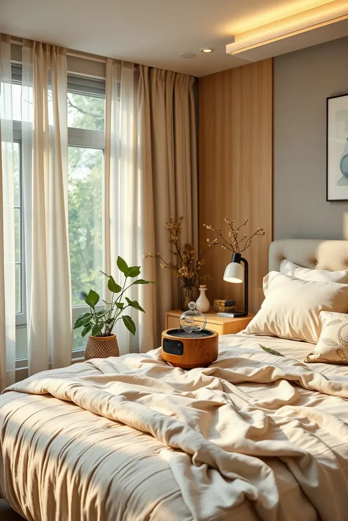 Sound has a big effect on our sense of well-being and with rain, leaf sounds or the waves from the ocean, your bedroom can feel peaceful and safe for sleep. My sleep setup includes quiet or hidden speakers that softly play selected tracks from nature, slowing down the mind and helping people relax.