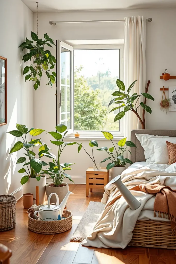 As soon as you make your bedroom biophilic, you need to ensure it stays lively. The needs of your plants, the amount of light and the materials request attention and change from season to season. I notice that when people use simple upkeep methods, they’re more likely to keep their space in good shape.