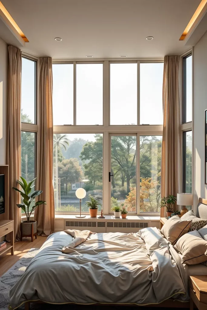 During design, I make sure the bed is opposite or lined up with the biggest window. This way, the view feels they are a part of the environment inside the room. Glazing that covers the floors to the ceiling is the best choice, if practical. For windows that are not very big, I either get light drapes or go without them, so views are not obstructed.