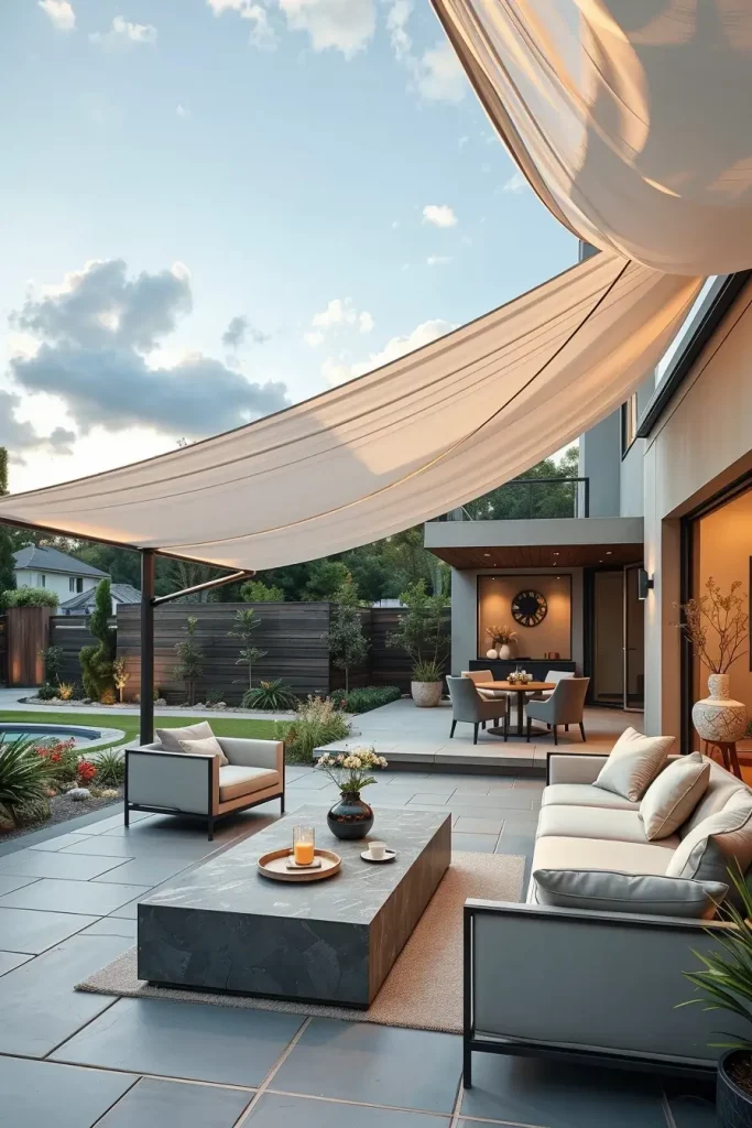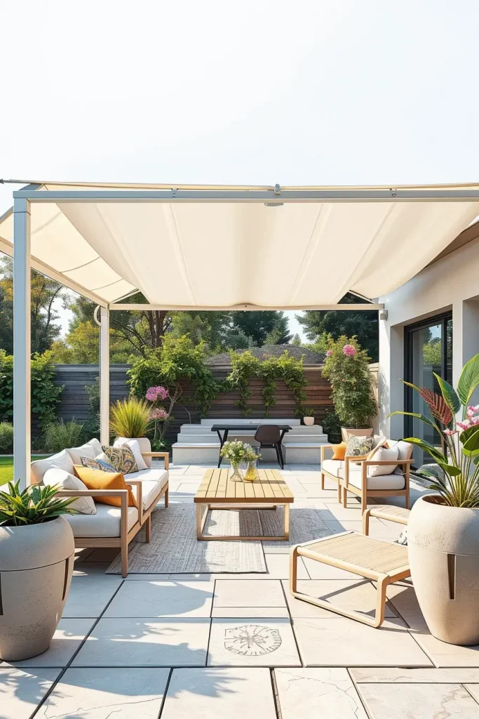 One of the most innovative canopy design ideas 2026 I have been exploring recently involves floating canopy structures above terraces. These canopies appear visually detached from heavy architectural supports, creating the illusion that the shade structure is gently hovering above the lounge area.