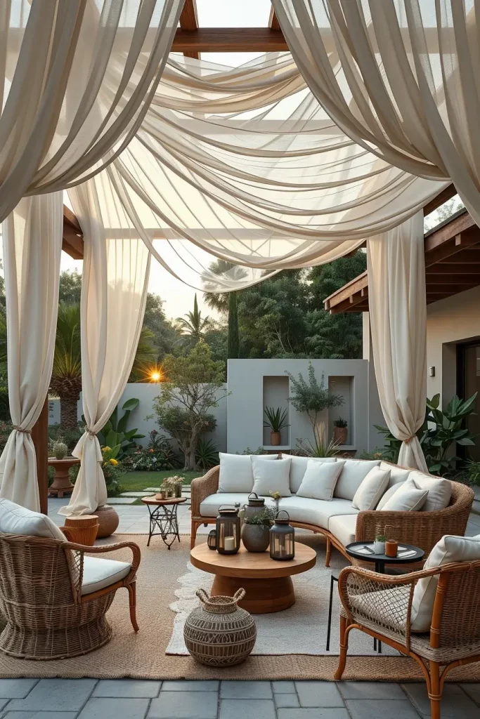 In such a setting, I usually combine low seating arrangements, woven poufs, patterned outdoor rugs, and handcrafted wooden tables. Decorative lanterns, ceramic accessories, and hanging tassels further enhance the artistic energy of the design. The fabrics themselves often vary in transparency and density, allowing light to pass through in different ways throughout the day, which adds a playful dynamic to the entire outdoor environment.