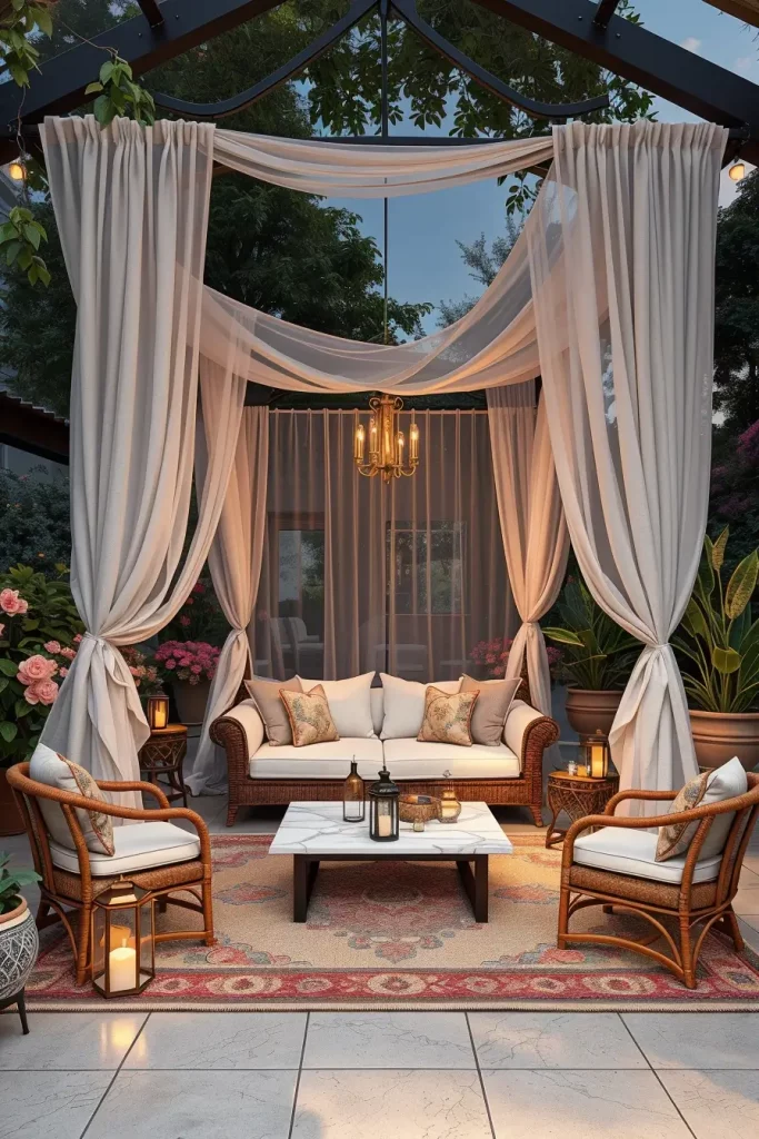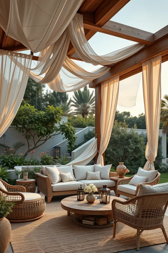 To achieve this atmosphere, I usually select airy fabrics such as linen or weather-resistant sheer textiles that move gently in the breeze. Beneath the canopy, I prefer comfortable lounge seating, woven chairs, soft outdoor rugs, and low wooden tables. These pieces create a layered and welcoming setting where the canopy becomes the visual centerpiece.