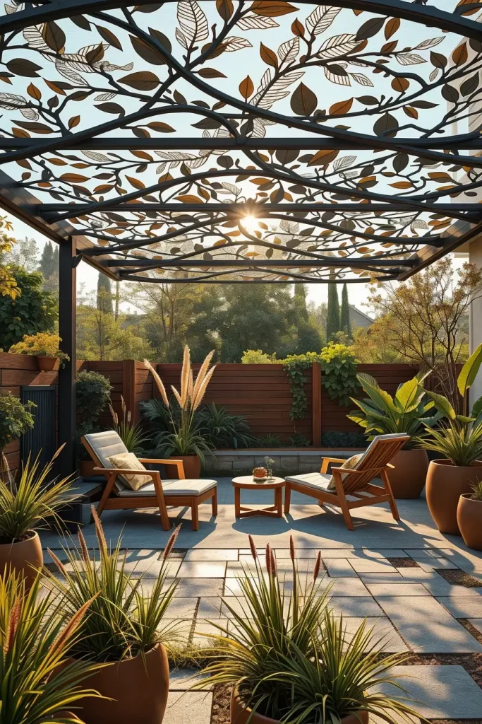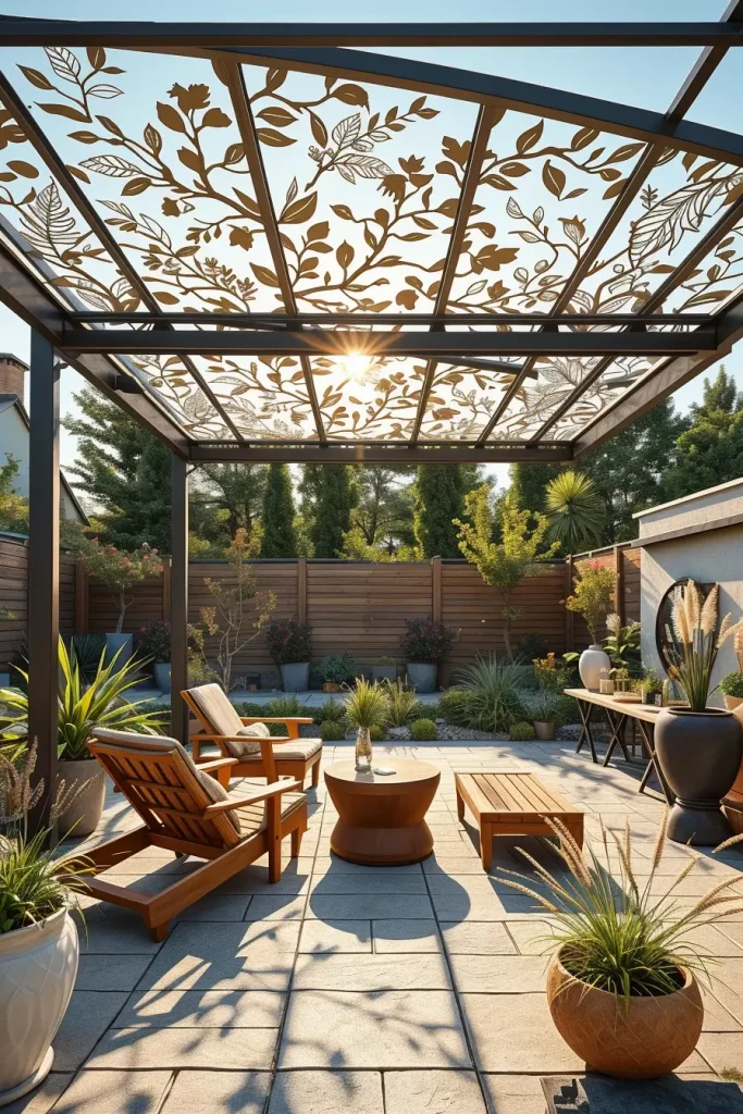 One of the most unique canopy design ideas 2026 I often recommend is a structure inspired directly by nature. Instead of traditional fabric, these canopies incorporate metal or laser-cut panels with leaf and branch patterns that filter sunlight in an organic way. The result is a shade structure that feels like an extension of the surrounding garden while still maintaining a strong architectural identity.