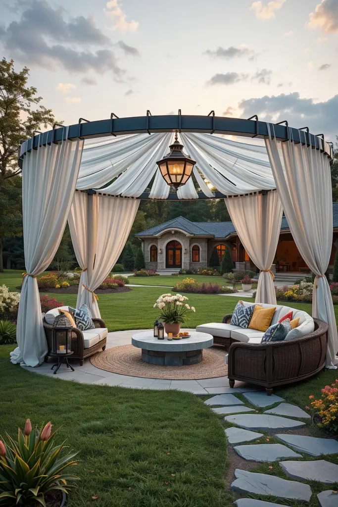 Inside the pavilion, I usually arrange curved sectional seating or a circular outdoor sofa that mirrors the shape of the canopy. A central coffee table made of stone, marble, or concrete anchors the layout, while layered rugs and sculptural lanterns bring warmth to the space. I also like to incorporate sheer curtain panels around the perimeter of the structure so they can be drawn closed to create a more intimate environment.