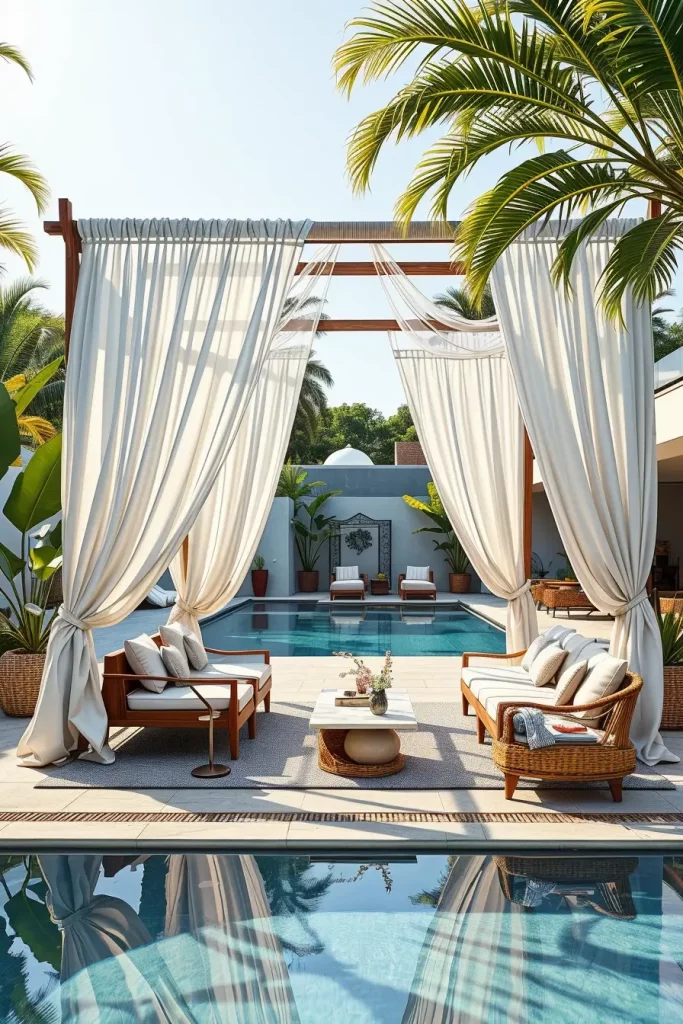 Some of the most stylish and creative canopy design ideas 2026 come directly from boutique hotels and resort environments. When I design poolside areas for residential projects, I often borrow inspiration from these hospitality spaces. Structured canopy frames with flowing curtains can transform a simple pool deck into a luxurious retreat that feels similar to a private cabana.