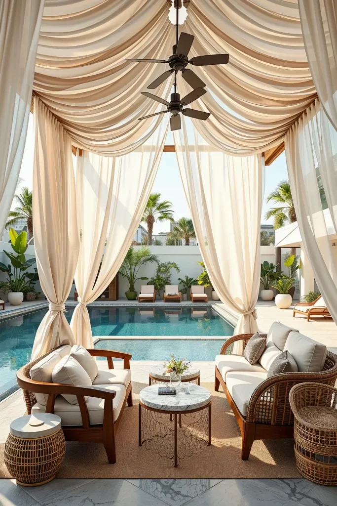 To achieve this look, I usually use light translucent fabrics such as sheer voile or outdoor chiffon attached to slim canopy frames. Beneath the canopy, I prefer deep lounge sofas, cushioned daybeds, or elegant rattan seating with soft neutral upholstery. Low marble or stone coffee tables, oversized outdoor pillows, and woven rugs complete the setting while making the lounge area comfortable and refined.