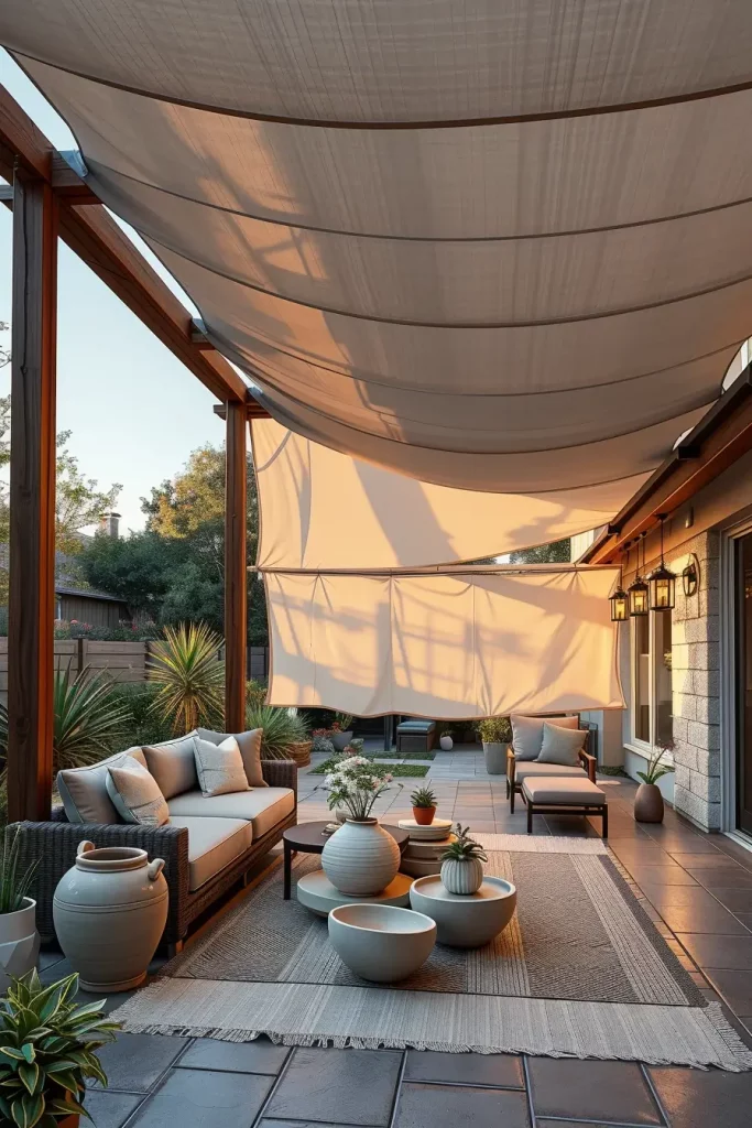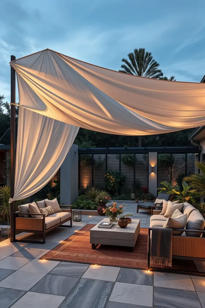 Personally, I believe that this approach works best when the canopy feels integrated with the surrounding landscape rather than simply attached to the house. Many designers referenced in publications such as Architectural Digest emphasize that fabric canopies should move naturally with the environment, creating a sense of movement and comfort. I have used this technique in several garden projects where clients wanted their outdoor lounge area to feel both intimate and visually expressive.