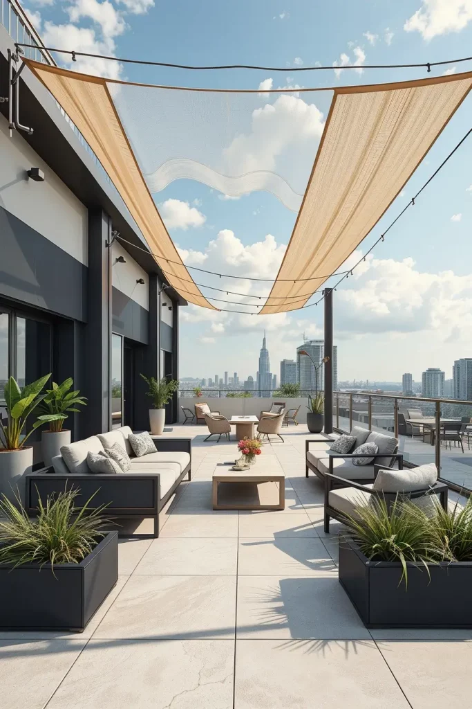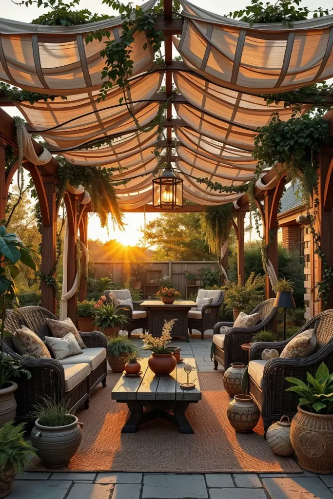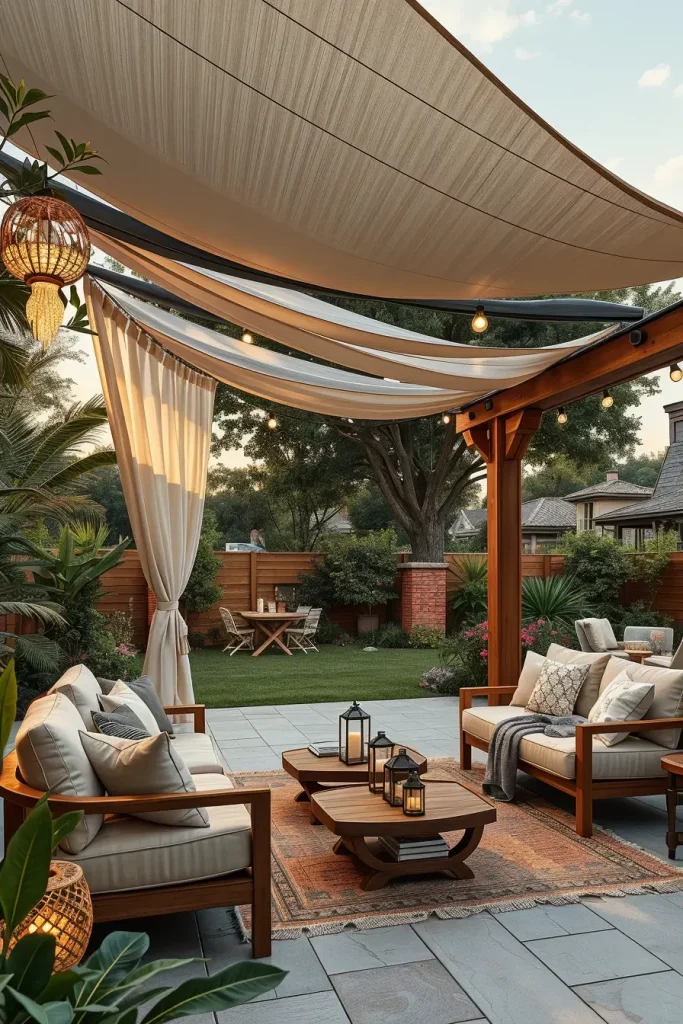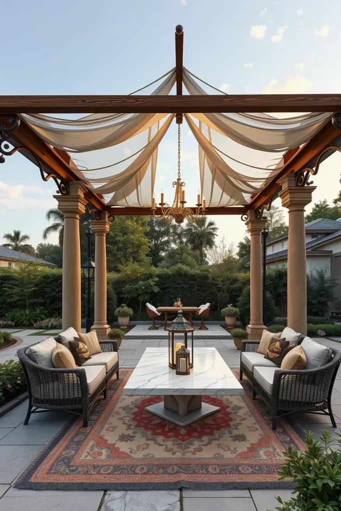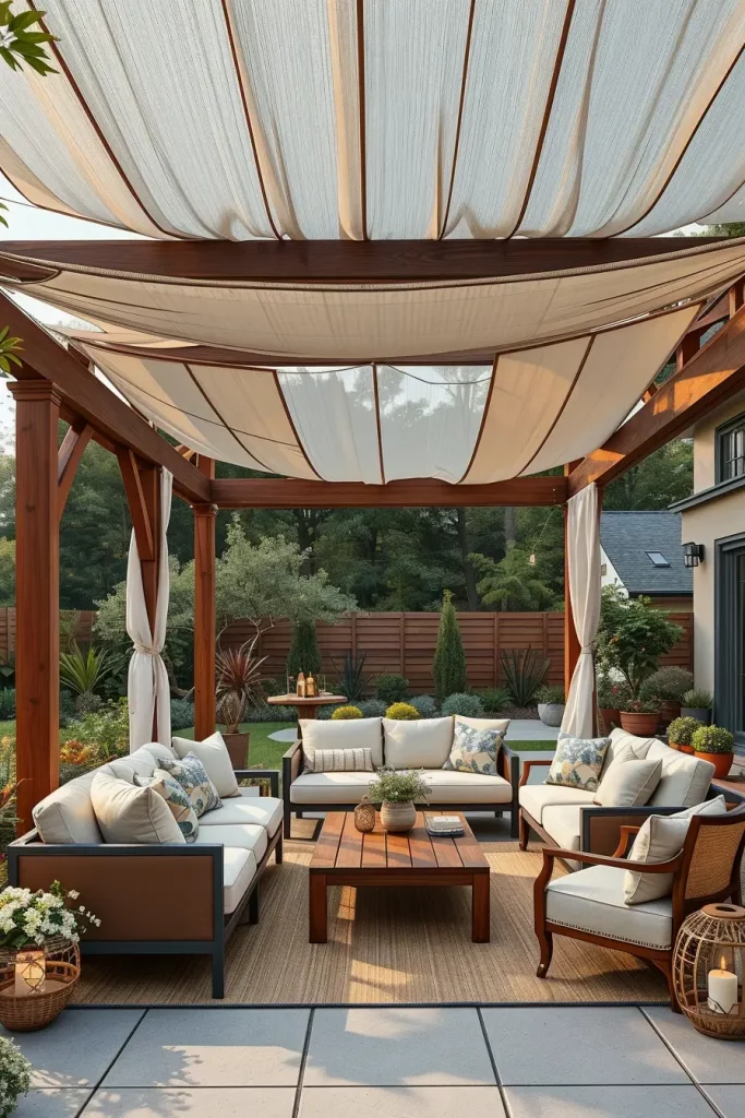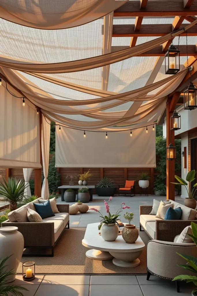 In many of my designs, I mix light linen fabrics with wooden pergola beams or metal frames. Beneath the layered canopy, I place modular outdoor sofas, textured rugs, and sculptural coffee tables to reinforce the sense of dimension. Decorative lanterns, ceramic planters, and hanging pendant lights help draw the eye upward toward the layered canopy structure.