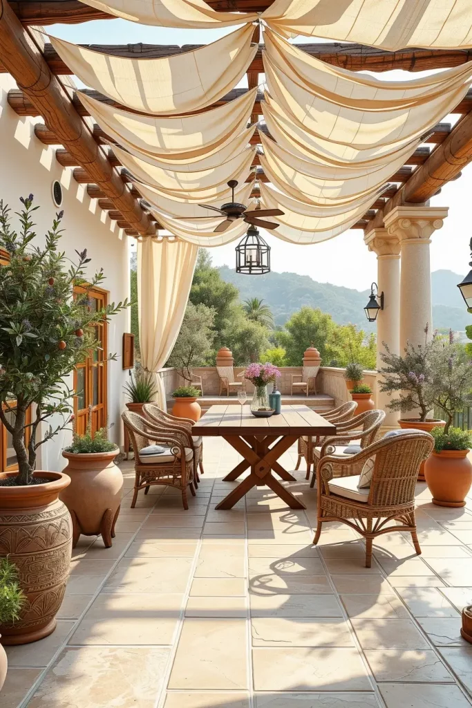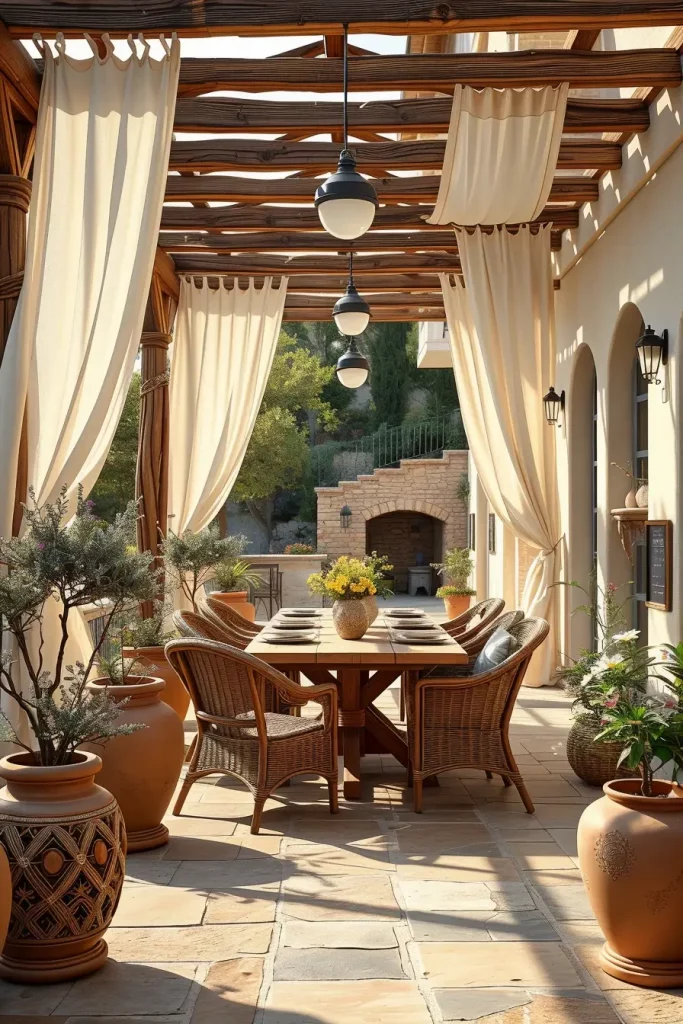 For furniture, I typically include wooden dining tables, woven rattan chairs, and ceramic garden stools that complement the relaxed Mediterranean palette. Terracotta planters filled with olive trees, lavender, or rosemary reinforce the natural character of the space. I also like to use light stone flooring or warm-toned tiles beneath the canopy to create visual continuity between the architecture and the outdoor seating area.