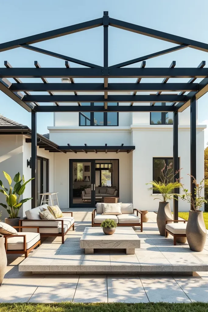 When designing such spaces, I usually combine the black canopy frame with neutral outdoor furniture such as beige or gray sofas, concrete coffee tables, and minimalist lounge chairs. Wooden decking or pale stone flooring beneath the canopy softens the contrast and keeps the space balanced. I also like to add a few sculptural planters with tall greenery to introduce natural elements into the composition.