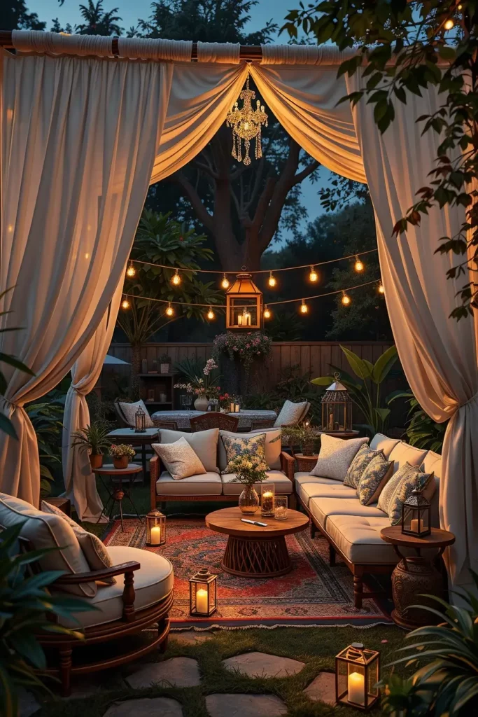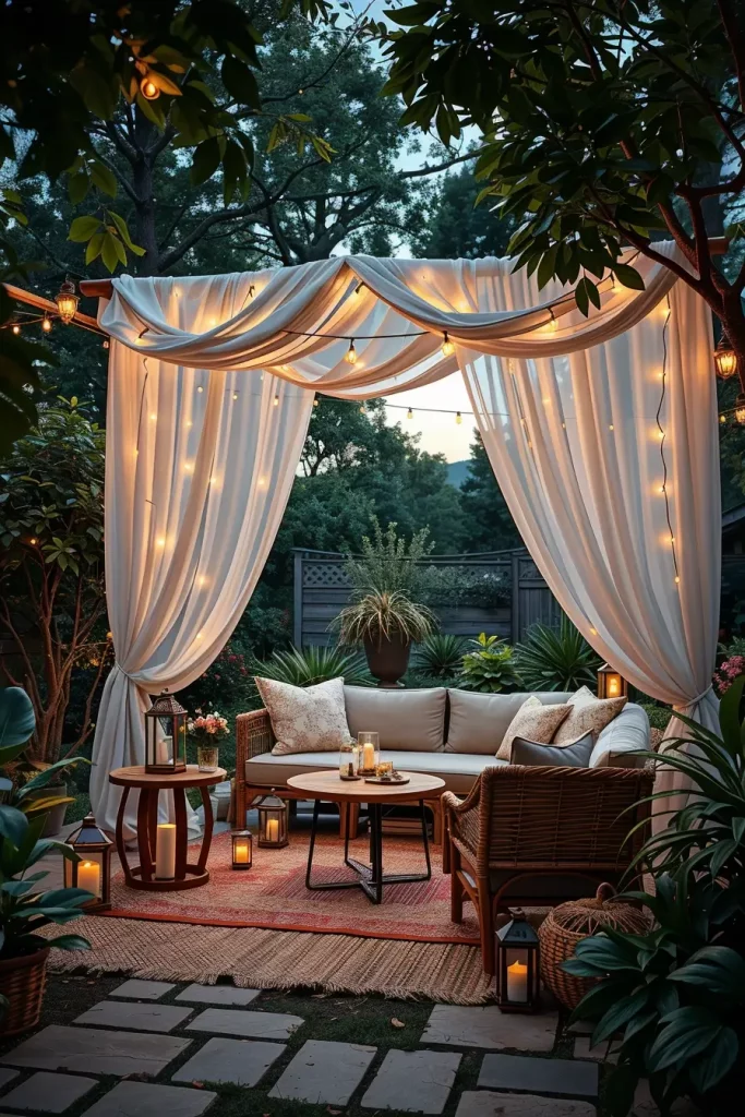 Romantic Backyard Canopies With Curtains And Soft Lighting