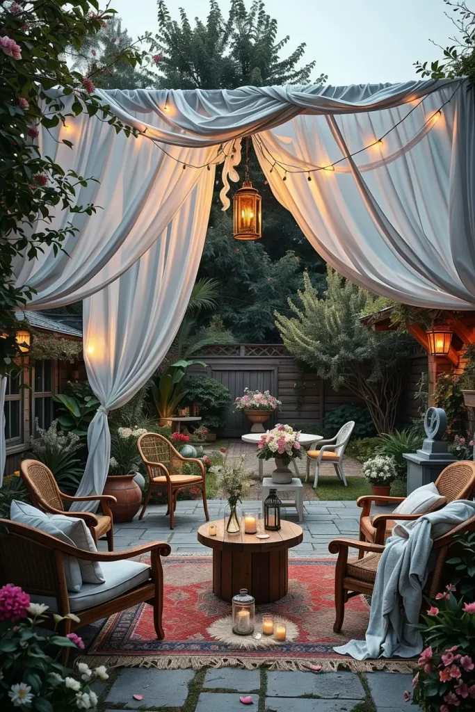 In my opinion, lighting plays an important role in making these fabric canopies feel magical. I frequently incorporate warm string lights, lanterns, or subtle LED strips hidden within the fabric folds. According to designers featured in Elle Decor, soft lighting dramatically enhances outdoor textiles by highlighting their movement and texture, and I have seen this effect transform even simple gardens.