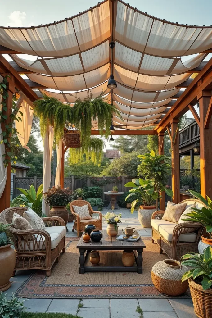 If I want to elevate the design further, I add hanging plants, rattan furniture, or floor lanterns that provide warm lighting in the evening. These additions make the canopy area feel complete while maintaining the effortless charm that defines bohemian outdoor design.