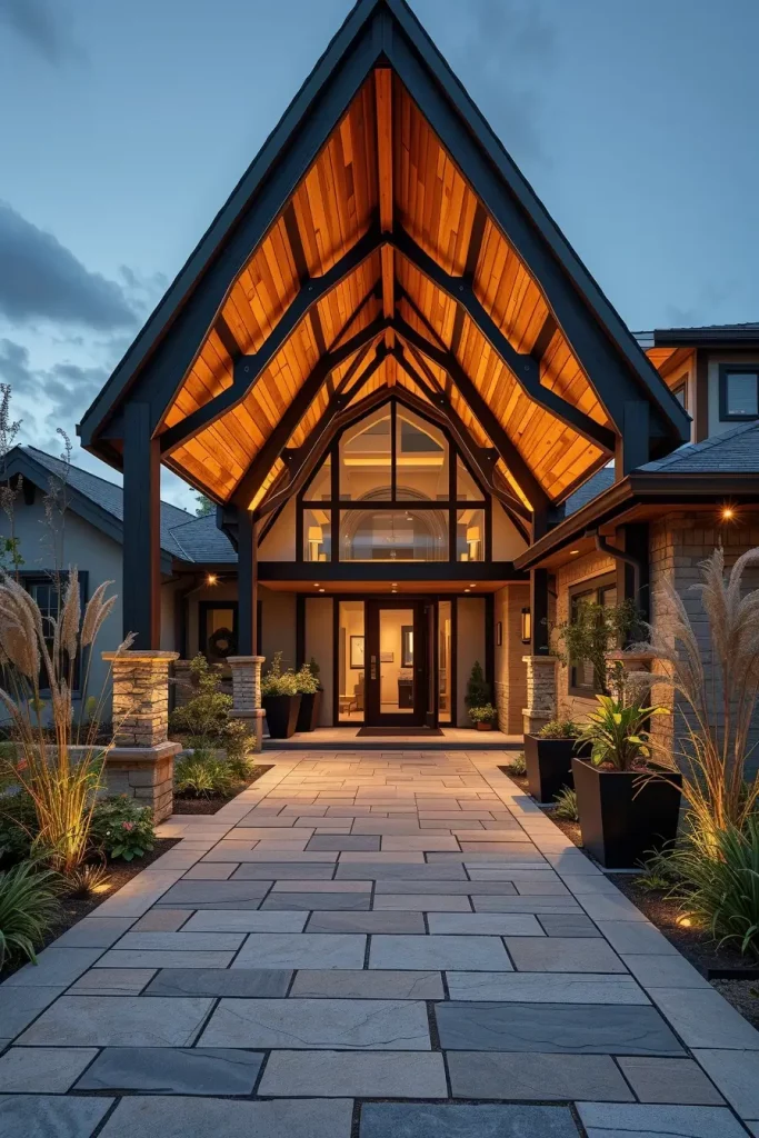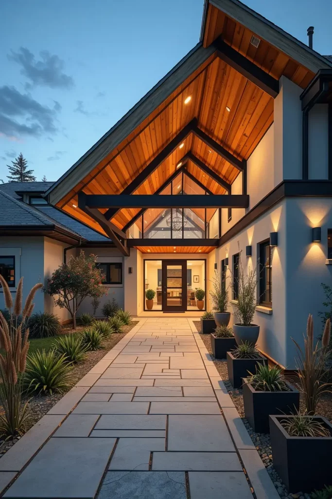 In my projects, I frequently combine structural metal frames with wood accents and integrated lighting. A long canopy extending over a walkway can visually lead guests toward the front door while protecting them from weather. Stone pavers, minimalist planters, and linear lighting fixtures reinforce the sense of direction and sophistication.
