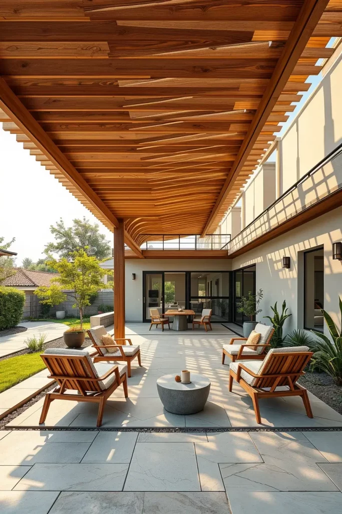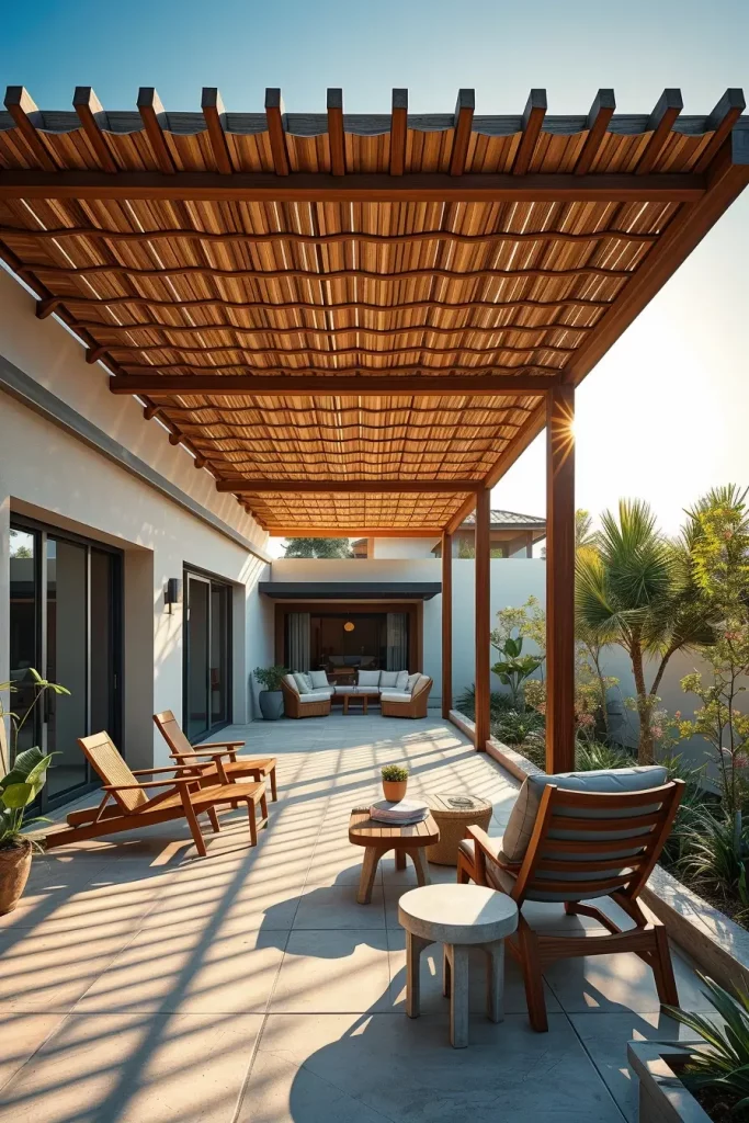To complement the slatted structure, I typically incorporate minimalist outdoor furniture such as teak lounge chairs, concrete side tables, and neutral outdoor cushions. The simplicity of these pieces ensures that the architectural canopy remains the focal point. Natural materials like stone flooring or gravel pathways further emphasize the organic aesthetic.