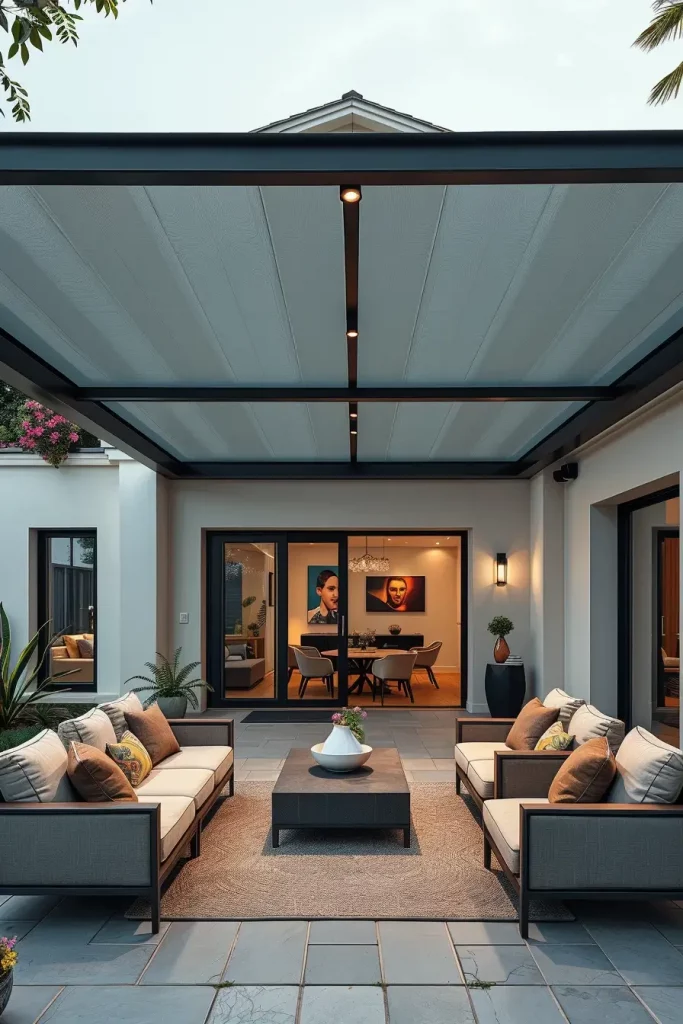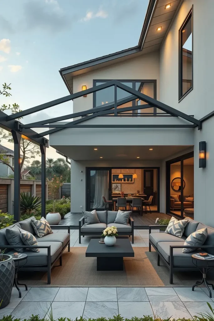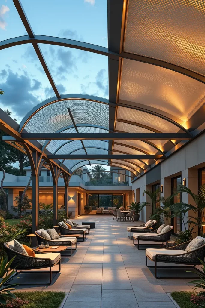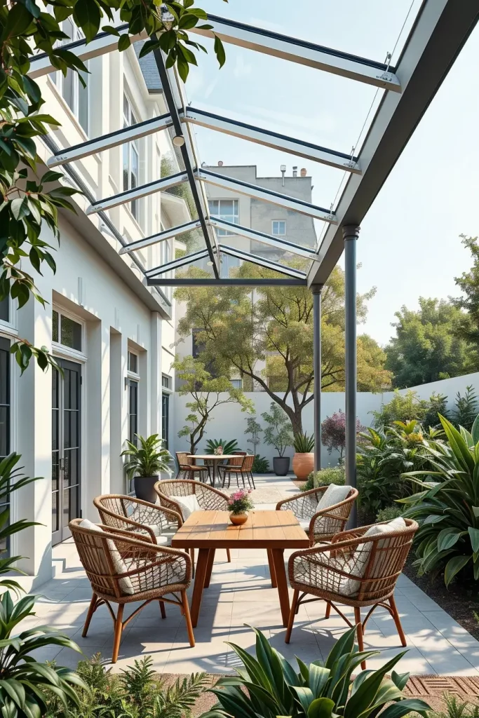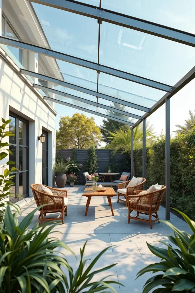 When designing such spaces, I usually select lightweight metal frames combined with clear roofing panels. Beneath the canopy, comfortable seating arrangements such as woven outdoor armchairs, minimalist sofas, and natural wood tables create a welcoming gathering area. Soft outdoor lighting and neutral textiles maintain a calm, modern aesthetic.