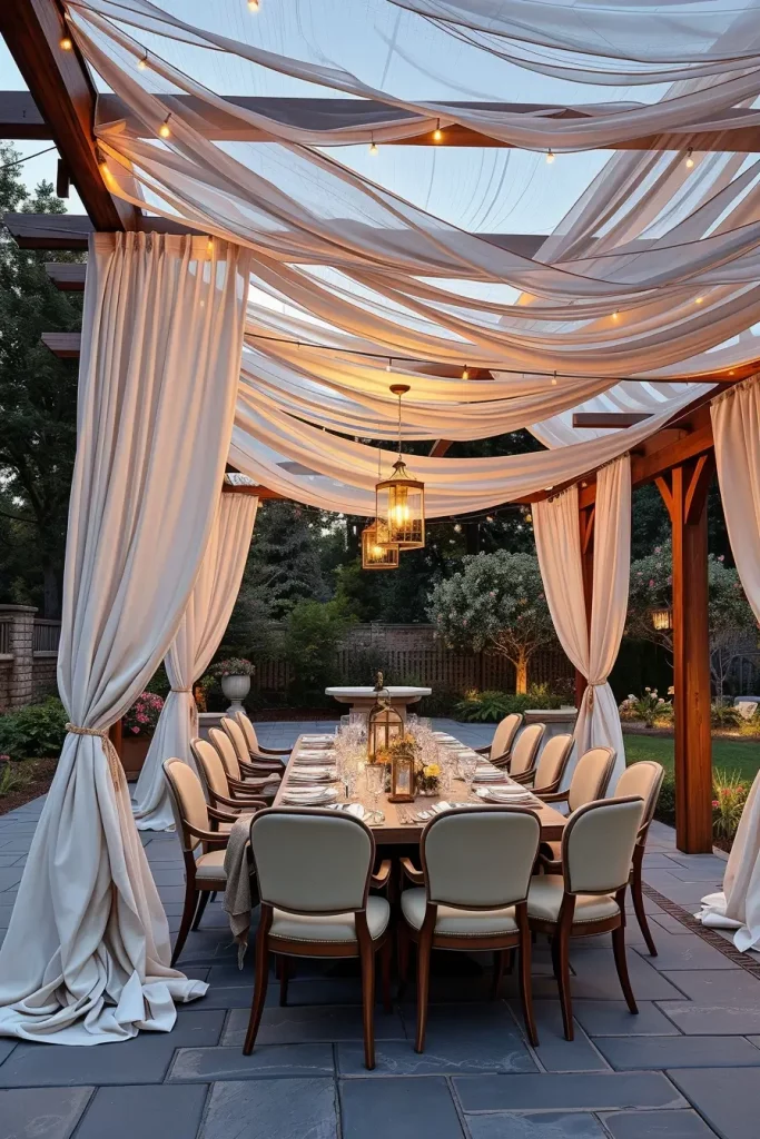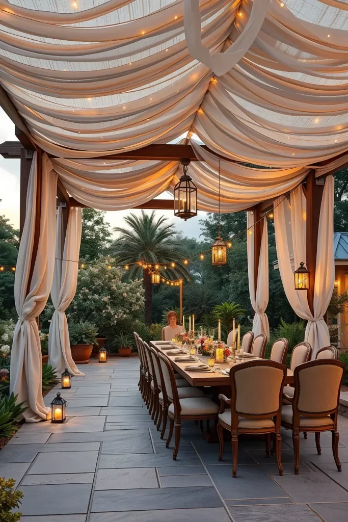 From my perspective, these artistic canopy designs work particularly well for evening gatherings, garden dinners, or outdoor celebrations. Designers frequently recommend layered textiles because they soften architectural structures while adding visual depth and romance to outdoor spaces.