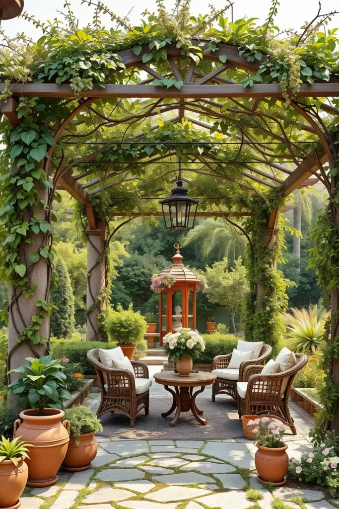 Artistic Pergola Canopies With Hanging Plants And Natural Textures