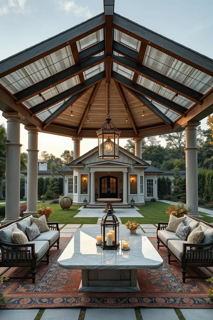 Luxury garden pavilions represent some of the most refined interpretations of canopy design ideas 2026. When I design these spaces, I treat the pavilion canopy almost like an outdoor room with a clearly defined architectural structure. Large columns or wooden beams support a roof-like canopy that provides generous shade while framing a sophisticated entertaining area.
