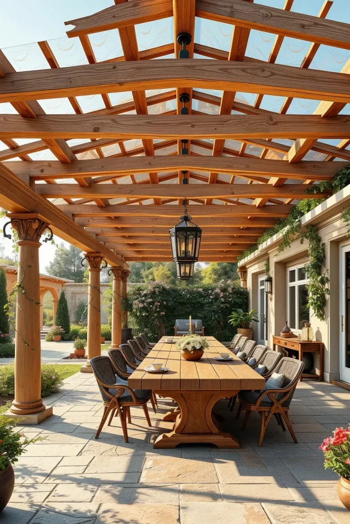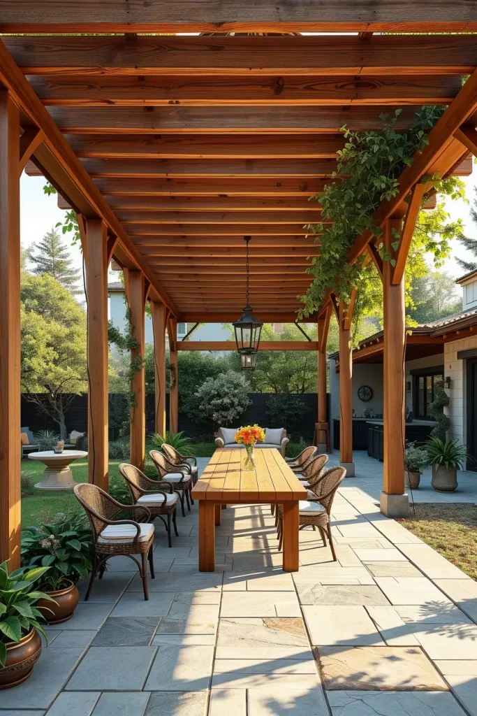 Beneath this type of pergola, I usually place comfortable outdoor seating such as wicker sofas, wood-framed lounge chairs, and large coffee tables made from reclaimed wood. Textured outdoor rugs, ceramic pots, and woven baskets enhance the natural atmosphere. Hanging planters filled with ferns, ivy, or trailing greenery soften the wooden structure above and create a lush garden canopy effect.