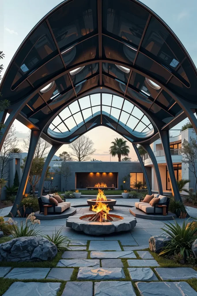I often see these canopies formed from curved metal panels, geometric frameworks, or asymmetrical structures that appear almost futuristic. Beneath the canopy, the furniture remains intentionally minimal—often consisting of sculptural seating pieces, smooth stone benches, and modern fire features. The focus remains on the dramatic architecture above.
